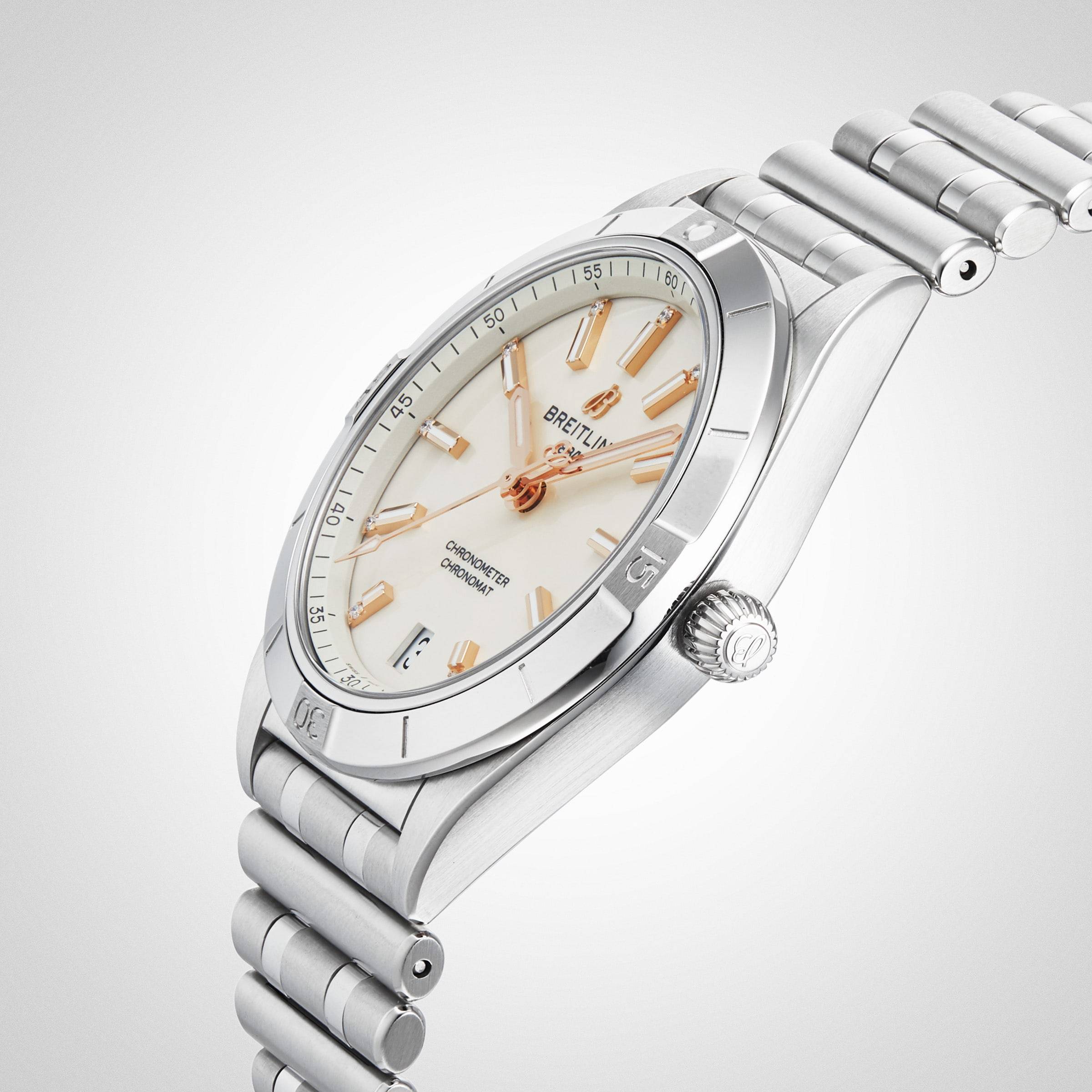 Featuring an array of vibrant dials, straps, and bracelets, all timepieces within the range are certified chronometers recognised by the COSC. This Chronomat Automatic 36 is characterized by the iconic Rouleaux bracelet with its butterfly clasp.