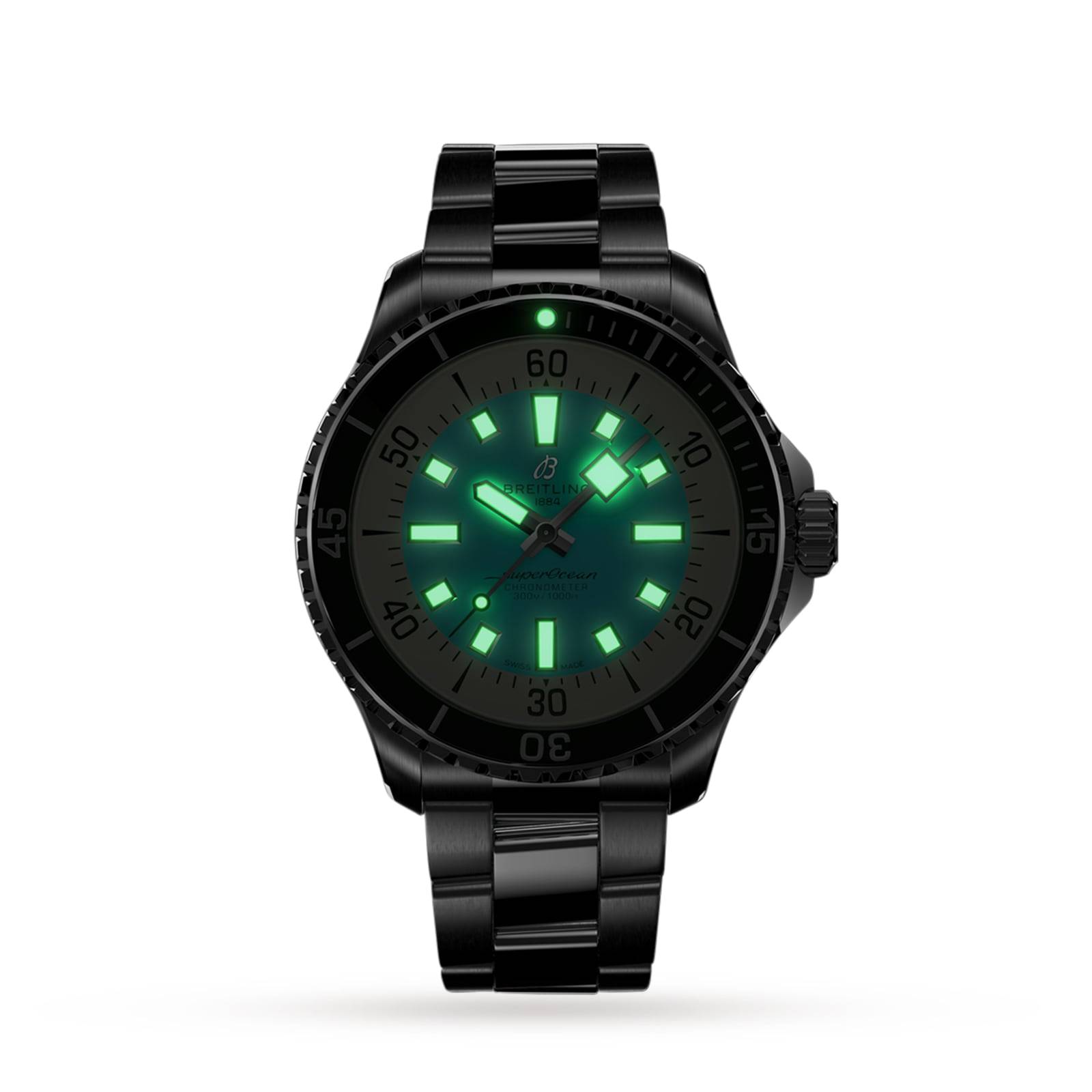 This 44m Superocean model features a striking turquoise dial designed to provide maximum legibility. Framed by a unidirectional bezel, this timepiece offers ultimate safety during even the deepest of dives.