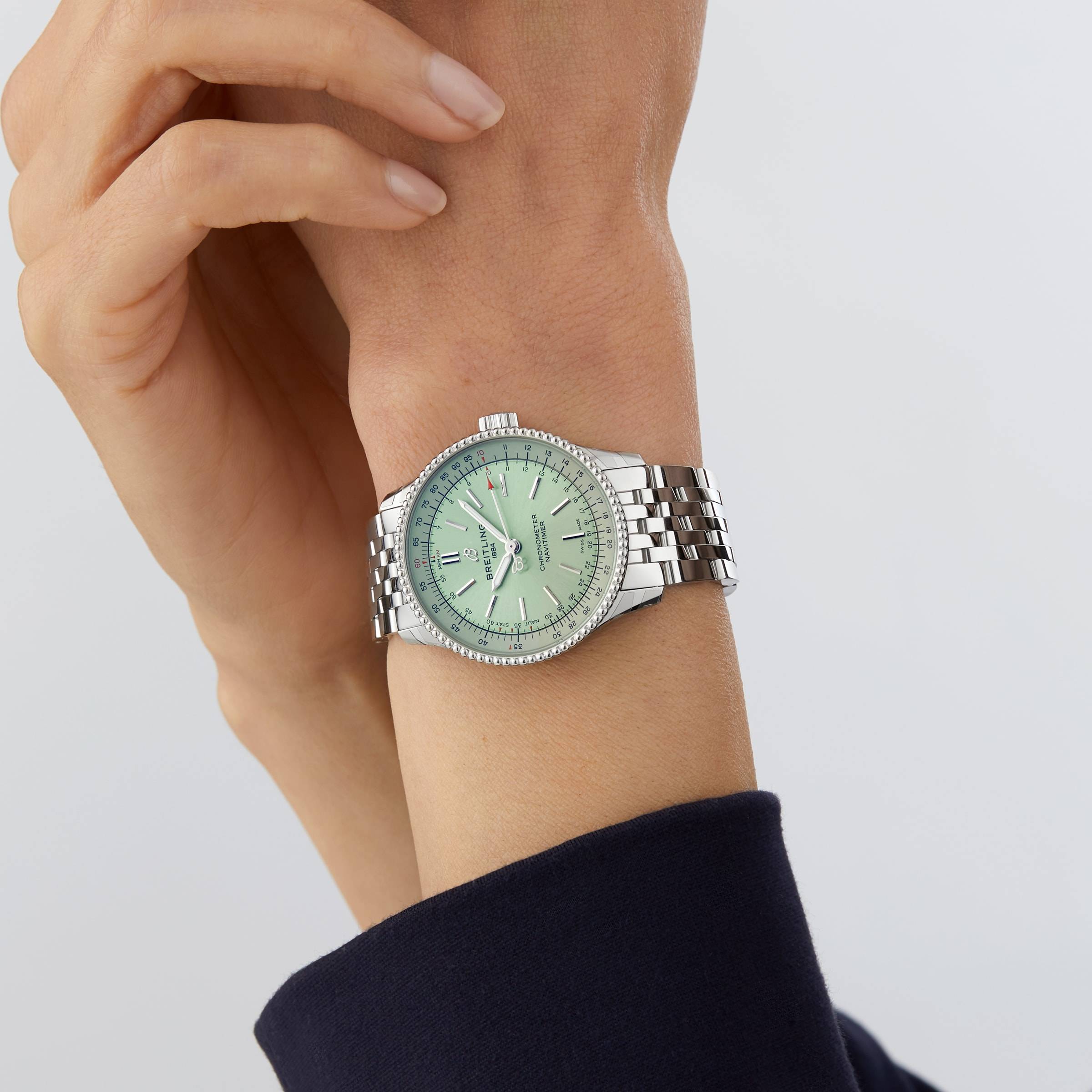 This Navitimer 35 model features a refreshing, mint green dial with silver-toned baton indexes and polished hands.