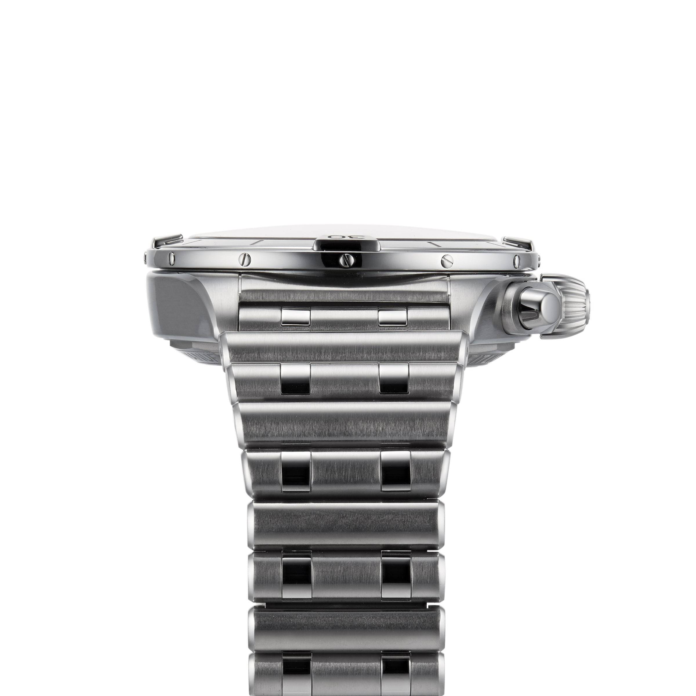 An elegant stainless steel bracelet presents the 42mm case, featuring an iconic bezel with four rider tabs.
