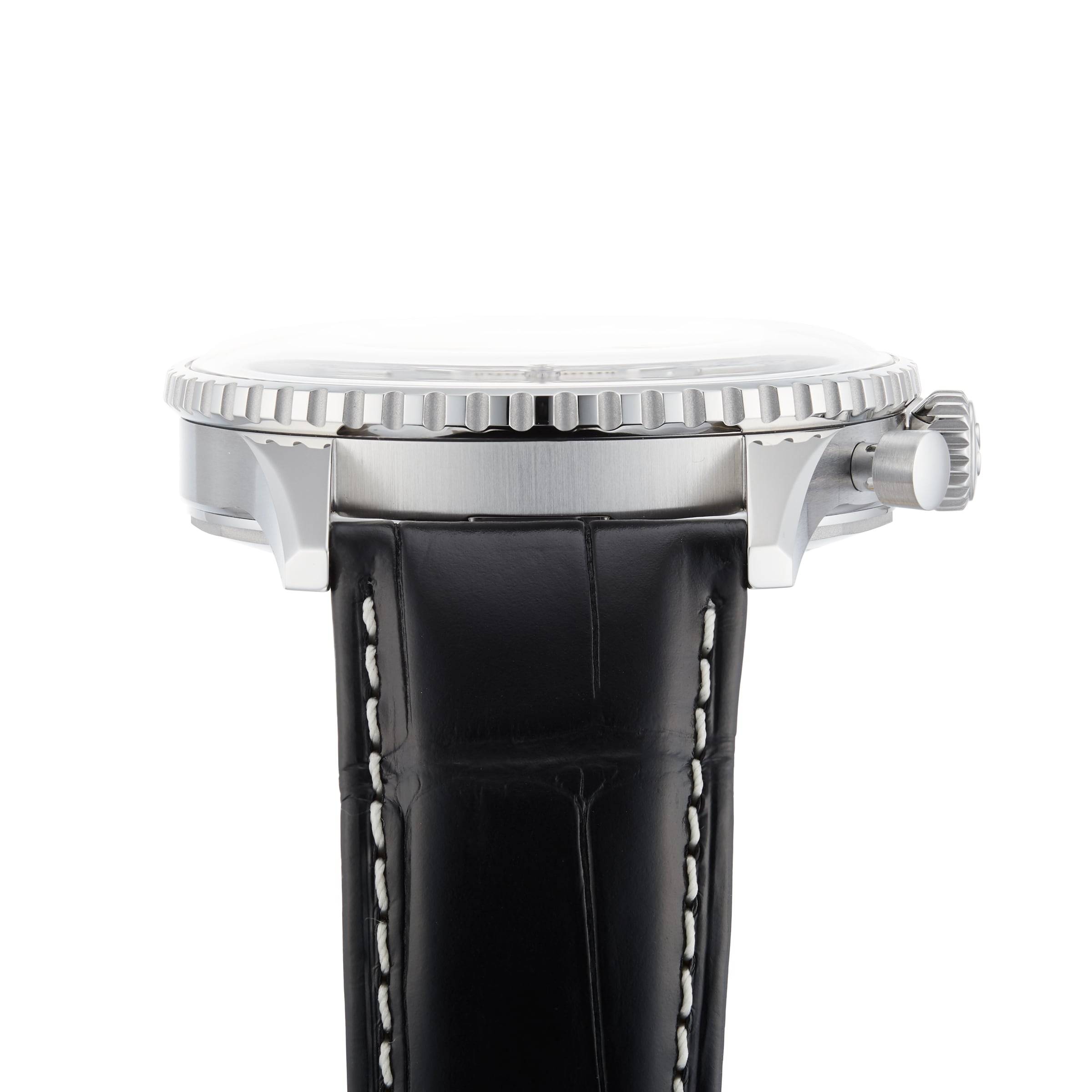 This exceptional timepiece features a black alligator strap with contrasting white stitching, and a sapphire crystal domed case for optimal comfort and clarity.