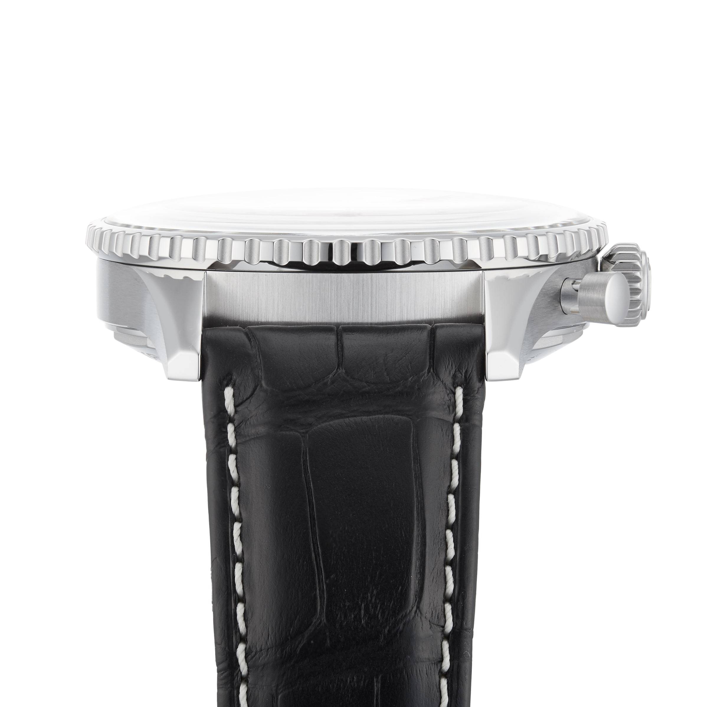 Presented on a black alligator leather strap with contrasting white stitching, this reinvigorated model features a 43mm stainless steel case with a bidirectional, slide rule bezel and two gaskets.