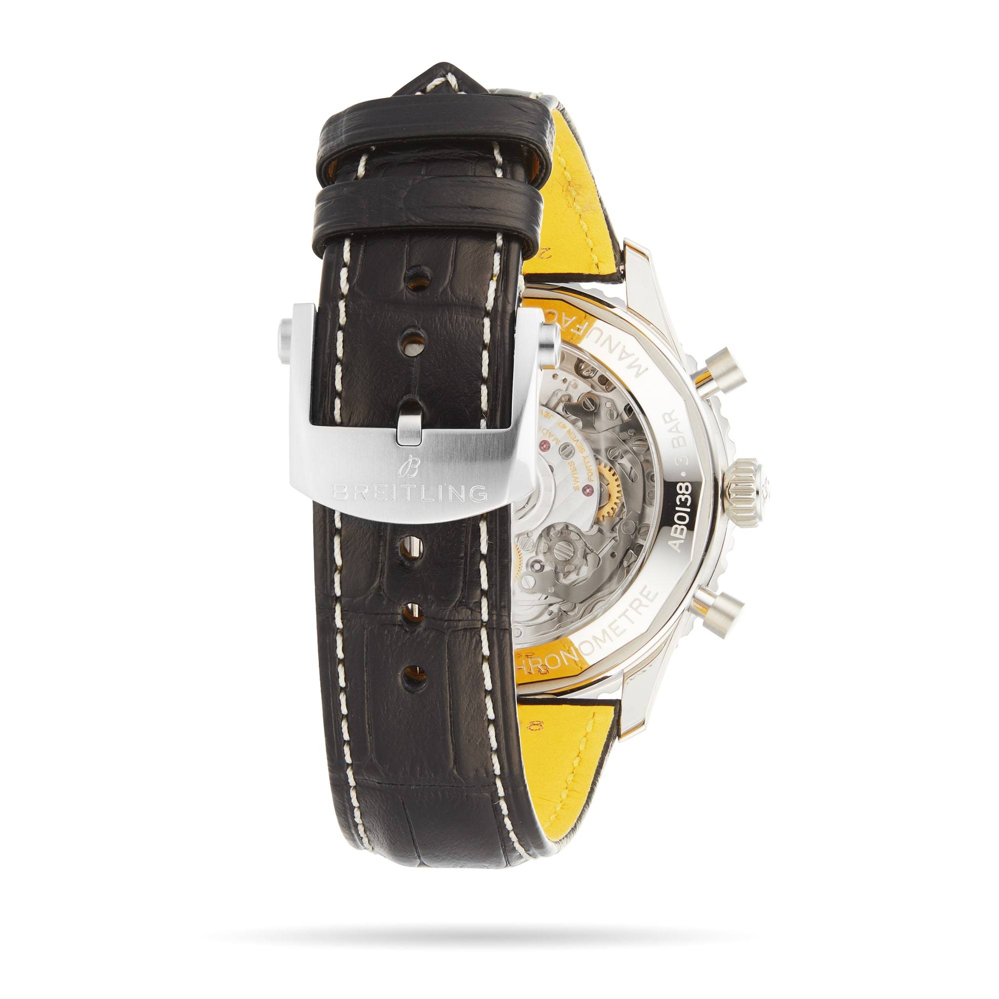 This Navitimer timepiece features a 43mm stainless steel case with a notched bezel for easy grip.