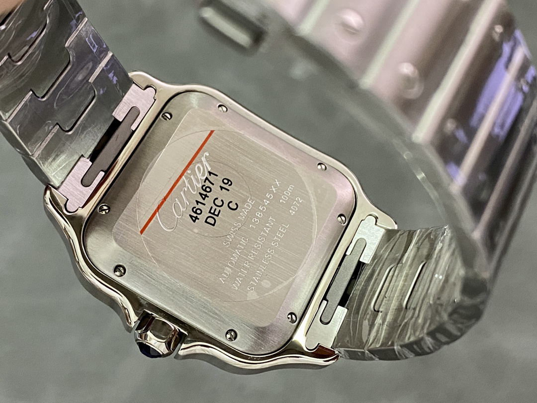 Santos watch, large model, self-winding mechanical movement, caliber 1847 MC. Stainless steel case, 7-sided crown set with faceted synthetic spinel, silvered opaline dial, stainless steel sword-shaped hands, sapphire crystal. Stainless steel bracelet. Case width: 39.8 mm, thickness: 9.38 mm. Water-resistant to 10 bar (approx. 100 meters/328 feet).