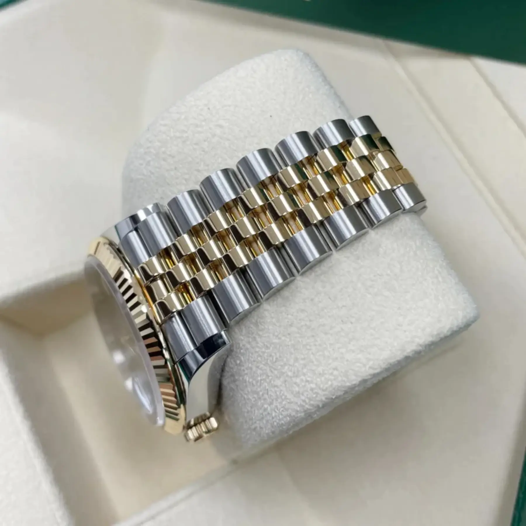 The Rolex fluted bezel is a mark of distinction. Originally, the fluting of the Oyster bezel had a functional purpose: it served to screw the bezel onto the case helping to ensure the waterproofness of the watch. It was therefore identical to the fluting on the case back, which was also screwed onto the case for waterproofness, using specific Rolex tools. Over time, the fluting became an aesthetic element, a genuine Rolex signature feature. Today the fluted bezel is a mark of distinction, in gold on this Datejust 36.