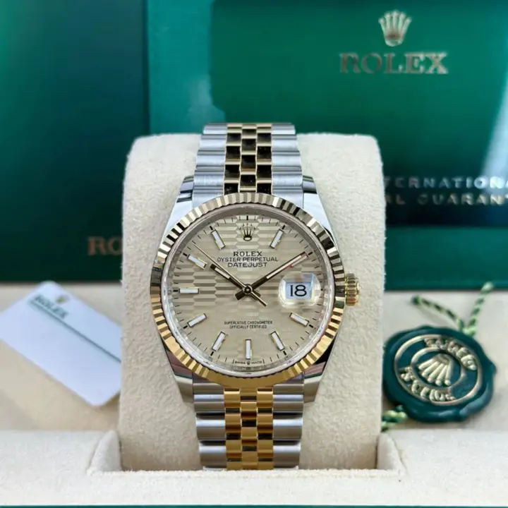The Rolex fluted bezel is a mark of distinction. Originally, the fluting of the Oyster bezel had a functional purpose: it served to screw the bezel onto the case helping to ensure the waterproofness of the watch. It was therefore identical to the fluting on the case back, which was also screwed onto the case for waterproofness, using specific Rolex tools. Over time, the fluting became an aesthetic element, a genuine Rolex signature feature. Today the fluted bezel is a mark of distinction, in gold on this Datejust 36.