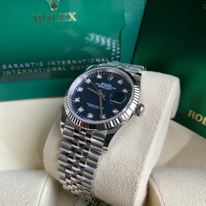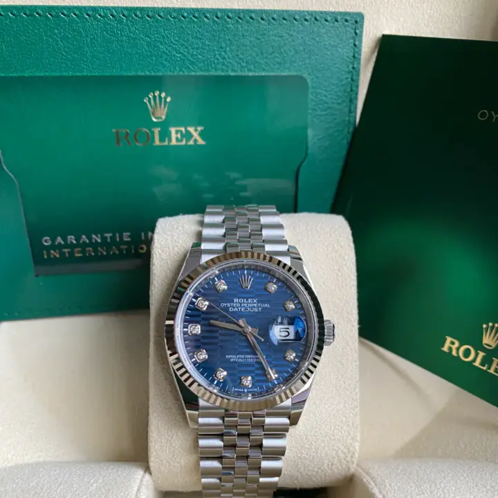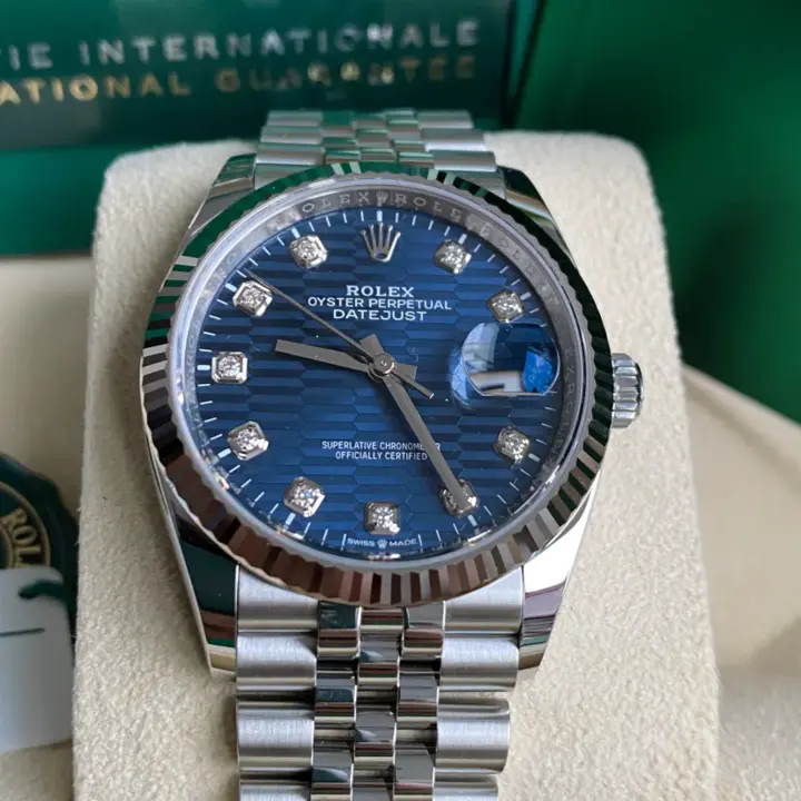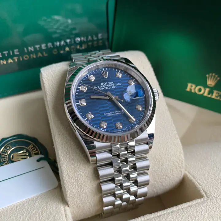 This dial features diamonds in 18 ct gold settings. The fluted motif is a graphic interpretation of an iconic Rolex design element: the bezel fluting found exclusively on some of the brand's Classic watches. Made from age-old materials, combined with cutting-edge technology, the fluted-motif dial brings depth and sophistication to the timeless Datejust.