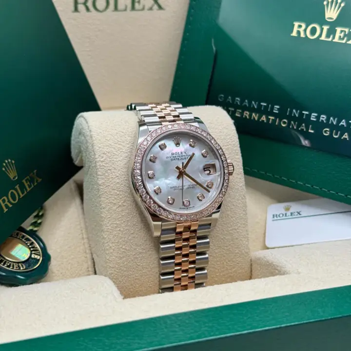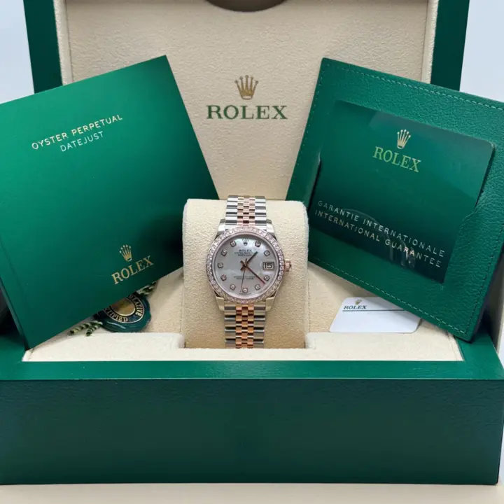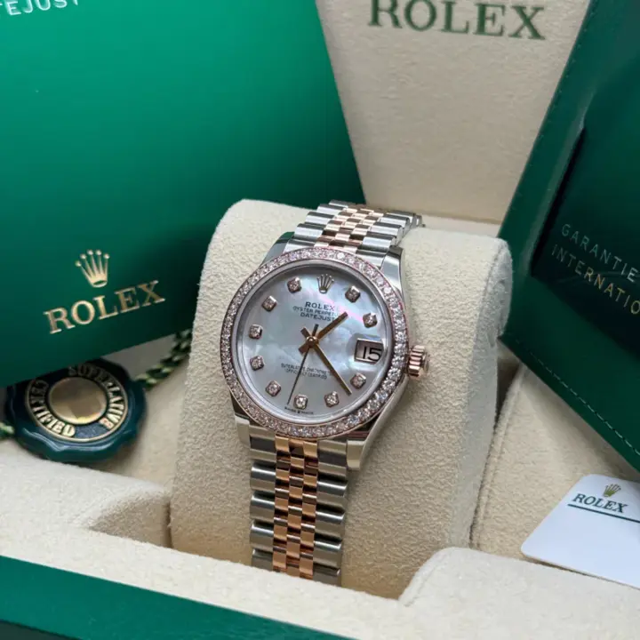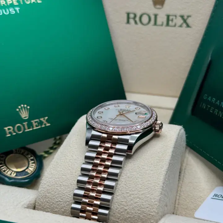 This dial features diamonds in 18 ct gold settings. Mother-of-pearl is by its nature full of mystery and surprises. Depending on its origin, it can be pink, white, black or yellow. It differs in colour, intensity and structure according to the part of the shell from which it is extracted. At Rolex, mother-of-pearl is never artificially coloured. Instead, particular know-how and skill are devoted to simply highlighting its natural beauty and preserving the original hues. As all mother-of-pearl dials are unique pieces, an identical dial will never be found on another wrist.