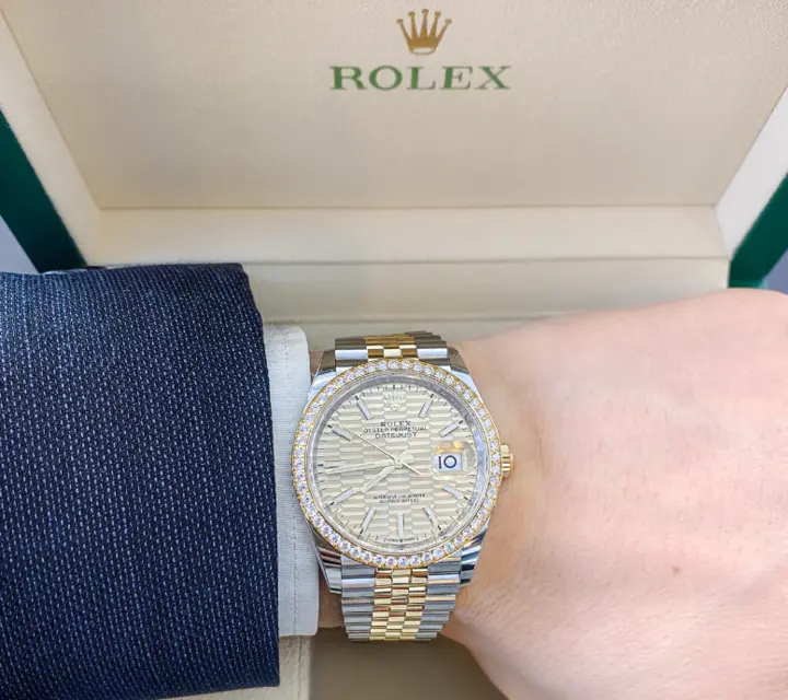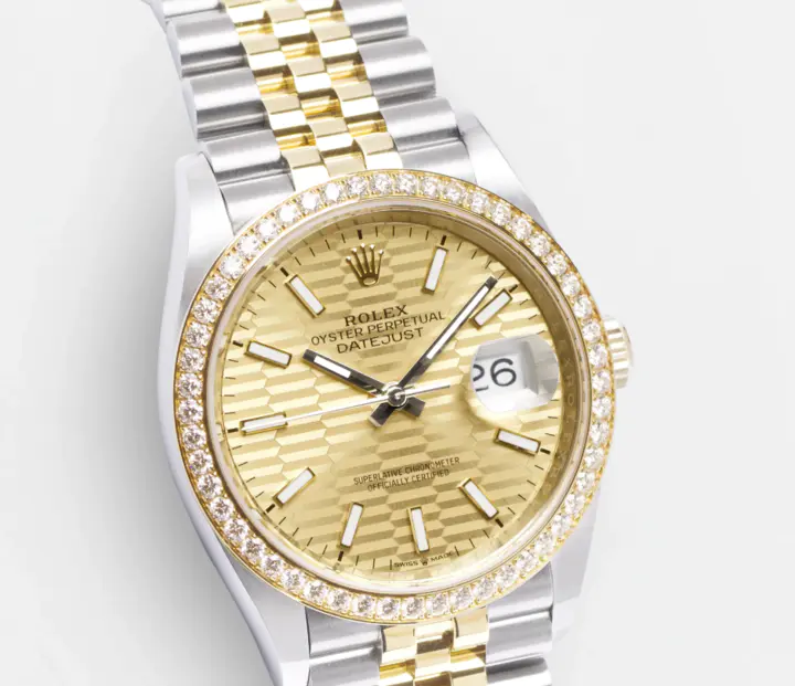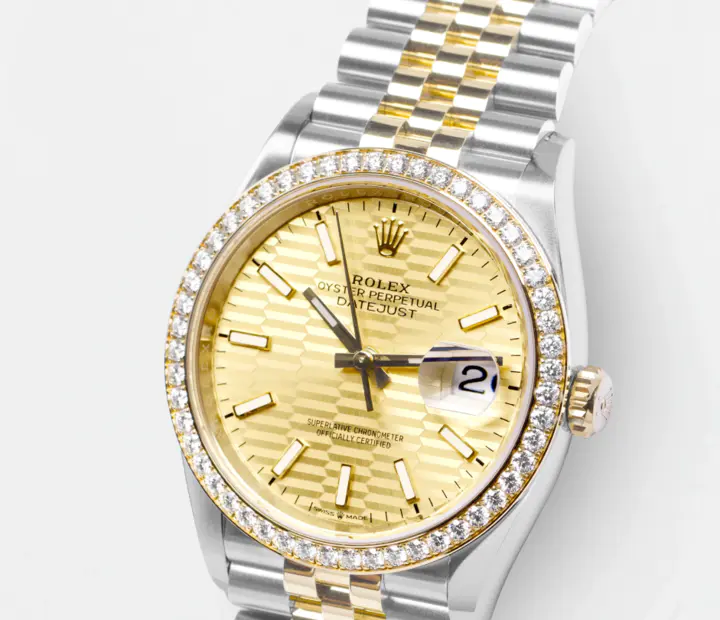 This dial features diamonds in 18 ct gold settings. The fluted motif is a graphic interpretation of an iconic Rolex design element: the bezel fluting found exclusively on some of the brand's Classic watches. Made from age-old materials, combined with cutting-edge technology, the fluted-motif dial brings depth and sophistication to the timeless Datejust.