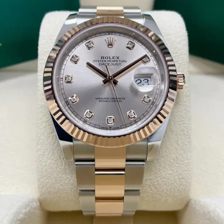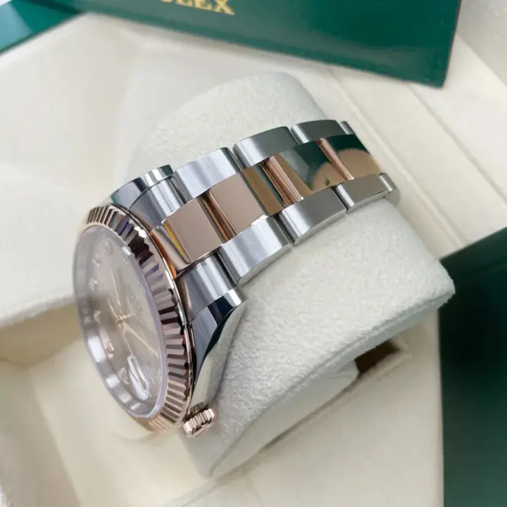 The Rolex fluted bezel is a mark of distinction. Originally, the fluting of the Oyster bezel had a functional purpose: it served to screw the bezel onto the case helping to ensure the waterproofness of the watch. It was therefore identical to the fluting on the case back, which was also screwed onto the case for waterproofness, using specific Rolex tools. Over time, the fluting became an aesthetic element, a genuine Rolex signature feature. Today the fluted bezel is a mark of distinction, in gold on this Datejust 41.