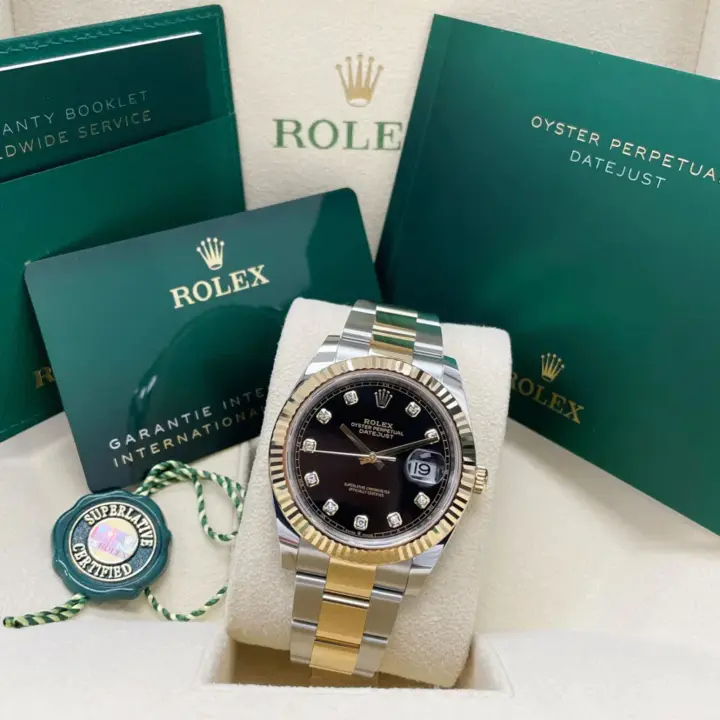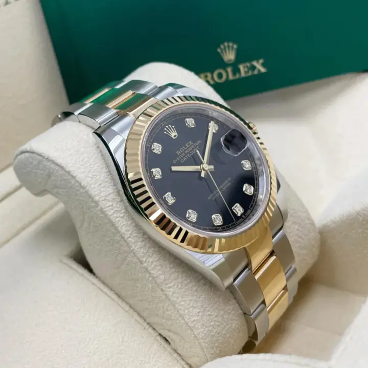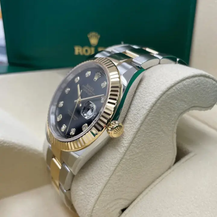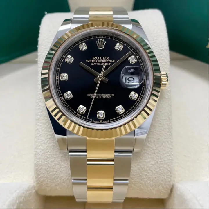 The Rolex fluted bezel is a mark of distinction. Originally, the fluting of the Oyster bezel had a functional purpose: it served to screw the bezel onto the case helping to ensure the waterproofness of the watch. It was therefore identical to the fluting on the case back, which was also screwed onto the case for waterproofness, using specific Rolex tools. Over time, the fluting became an aesthetic element, a genuine Rolex signature feature. Today the fluted bezel is a mark of distinction, in gold on this Datejust 41.