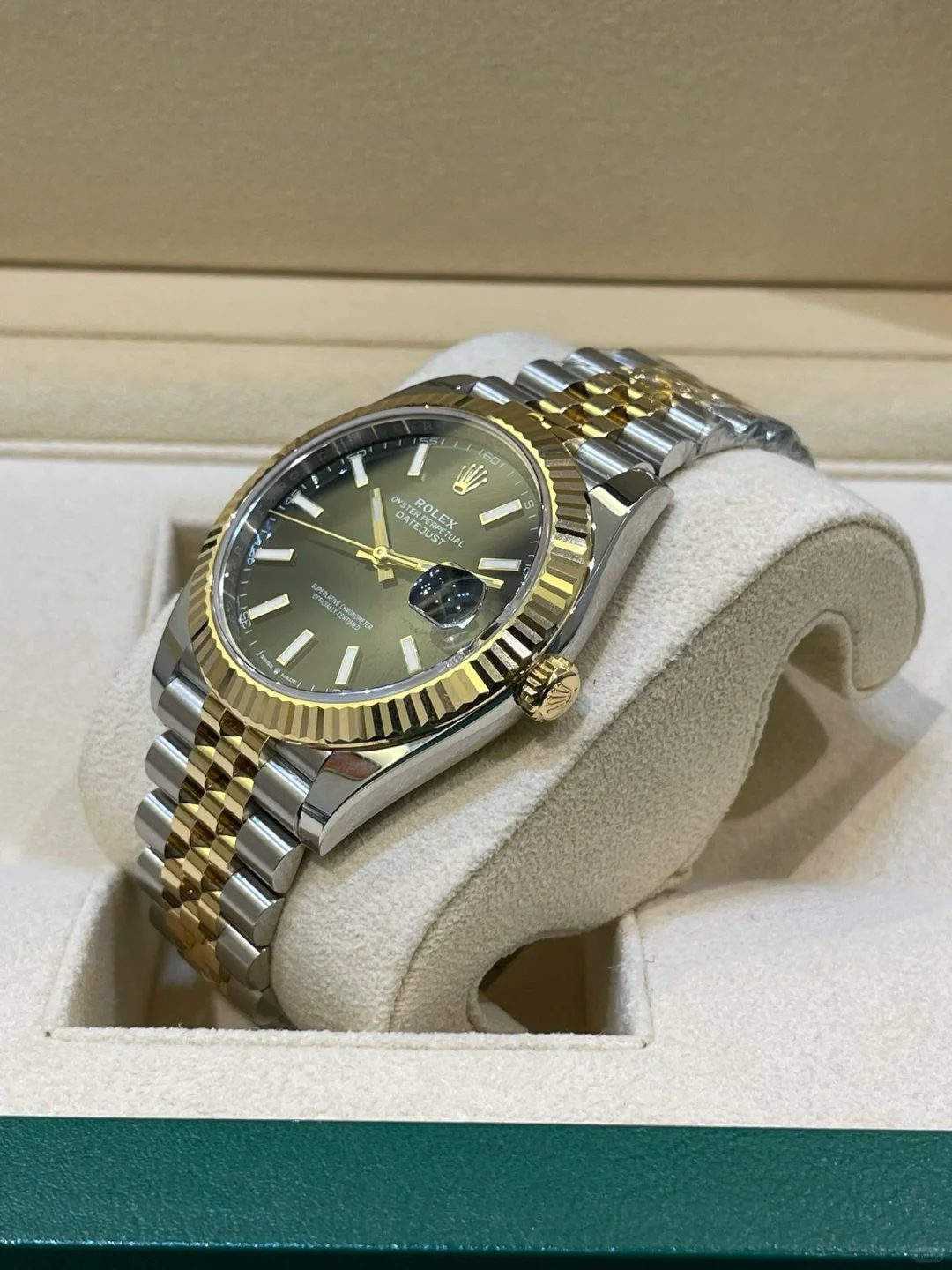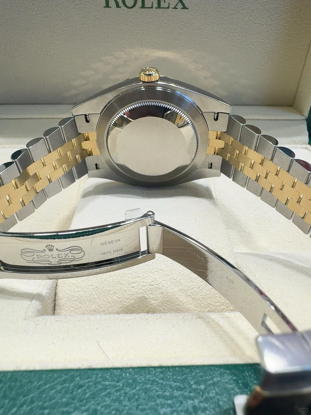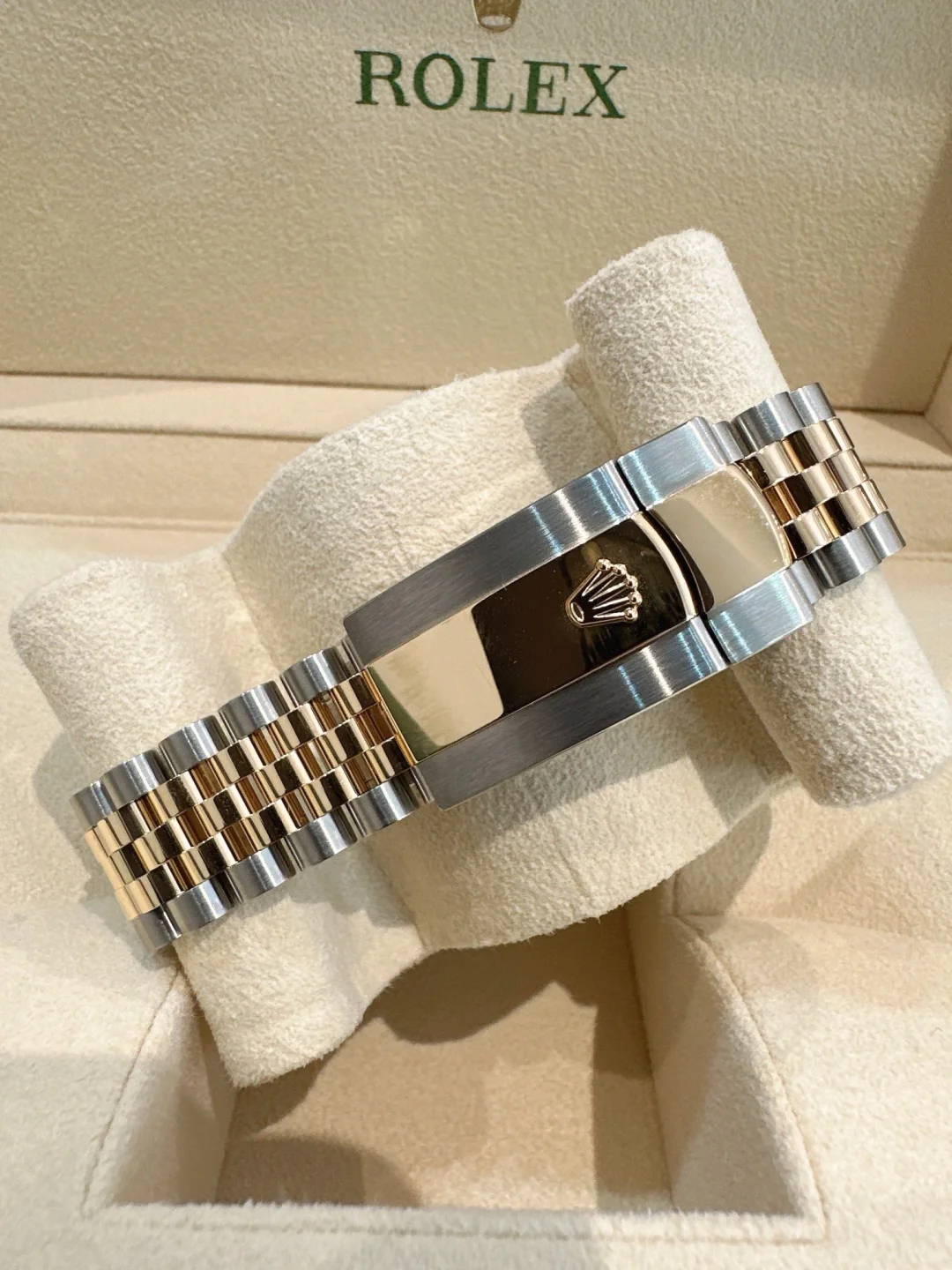 The Rolex fluted bezel is a mark of distinction. Originally, the fluting of the Oyster bezel had a functional purpose: it served to screw the bezel onto the case helping to ensure the waterproofness of the watch. It was therefore identical to the fluting on the case back, which was also screwed onto the case for waterproofness, using specific Rolex tools. Over time, the fluting became an aesthetic element, a genuine Rolex signature feature. Today the fluted bezel is a mark of distinction, in gold on this Datejust 41.