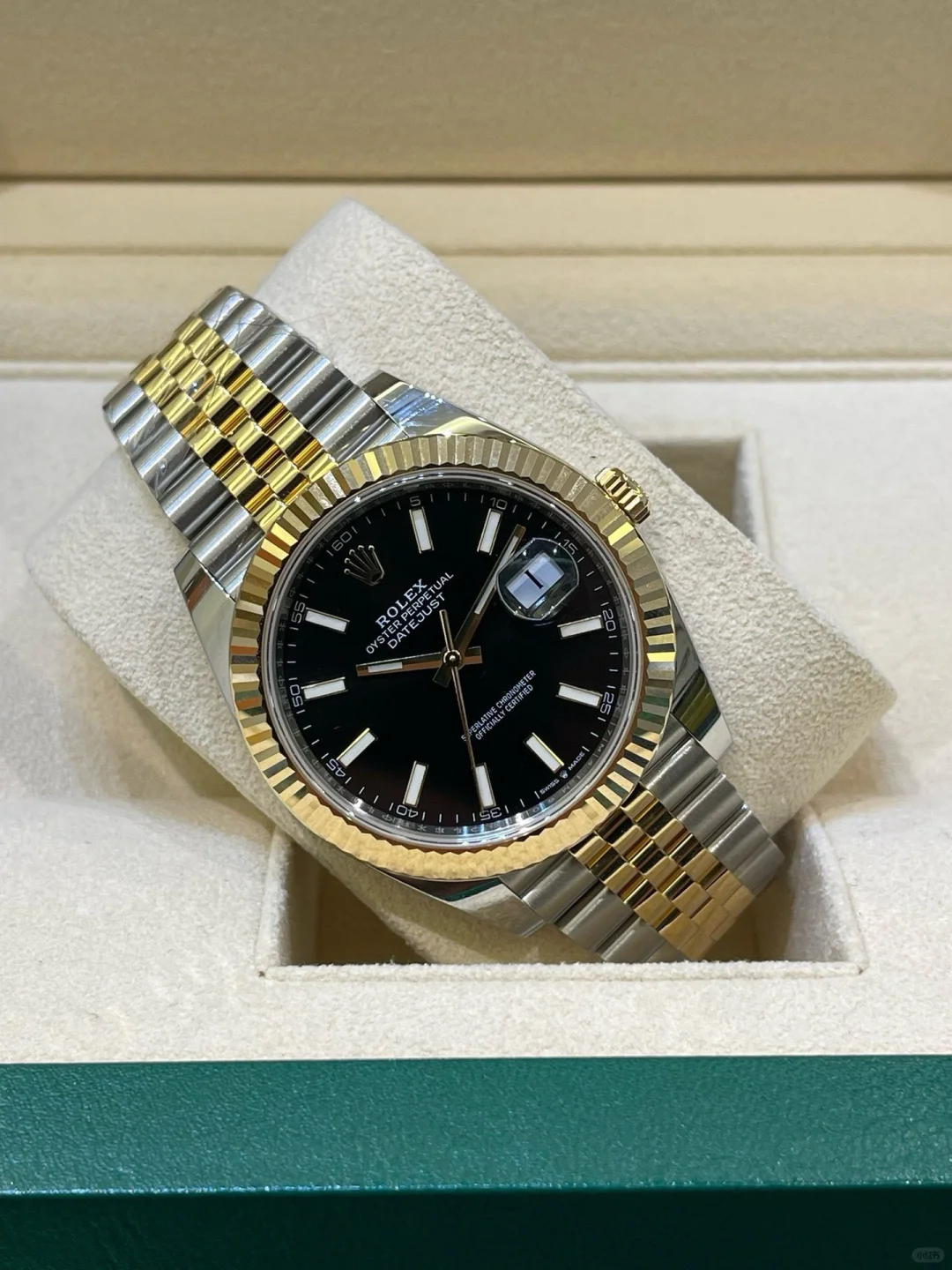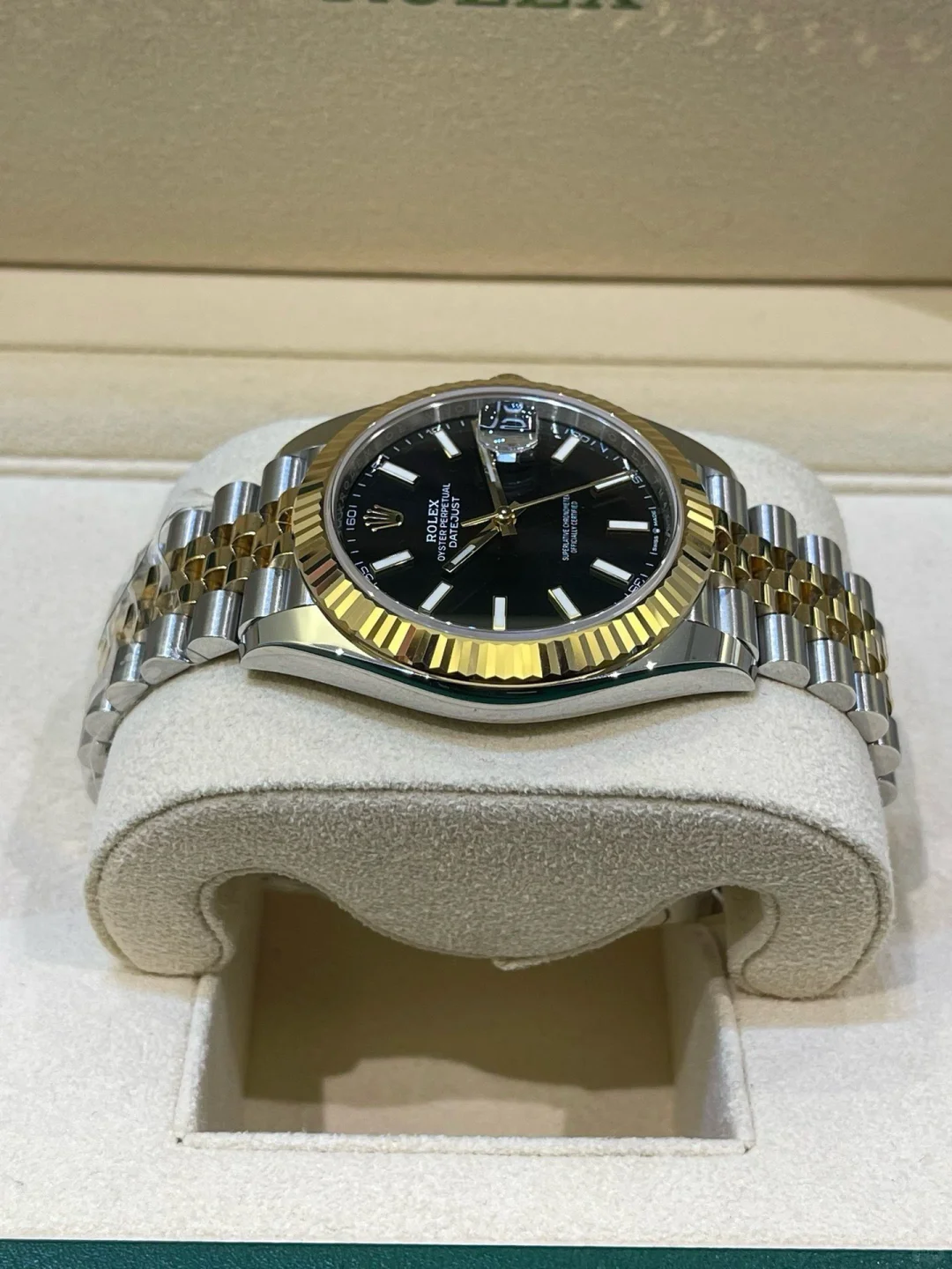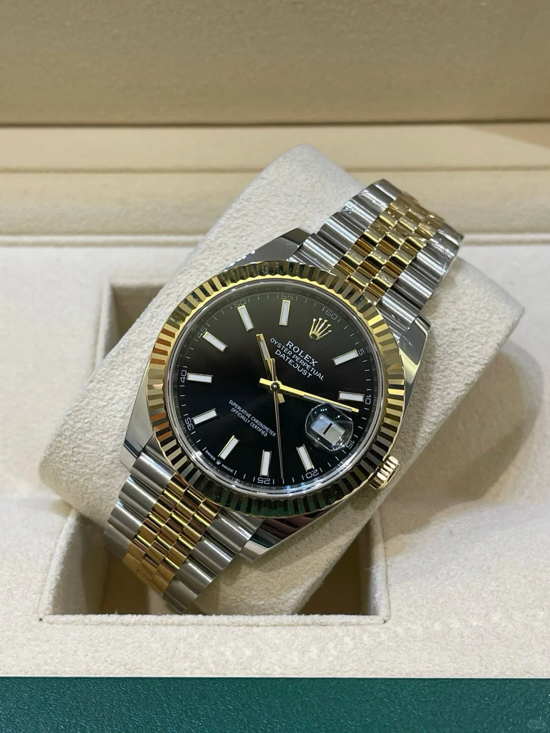 The Rolex fluted bezel is a mark of distinction. Originally, the fluting of the Oyster bezel had a functional purpose: it served to screw the bezel onto the case helping to ensure the waterproofness of the watch. It was therefore identical to the fluting on the case back, which was also screwed onto the case for waterproofness, using specific Rolex tools. Over time, the fluting became an aesthetic element, a genuine Rolex signature feature. Today the fluted bezel is a mark of distinction, in gold on this Datejust 41.