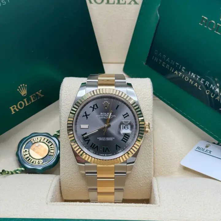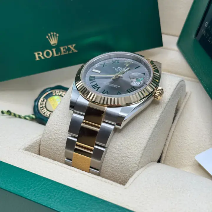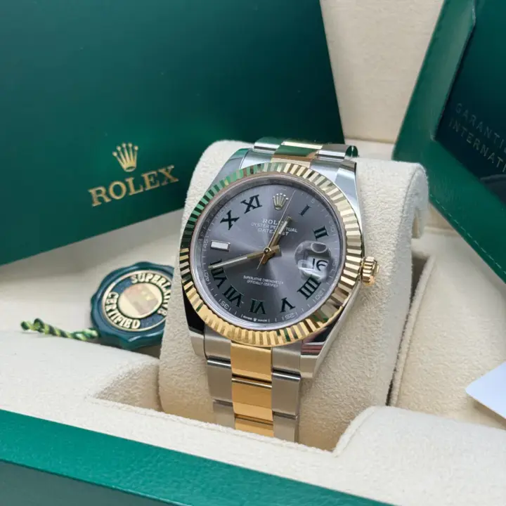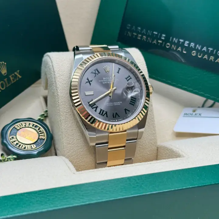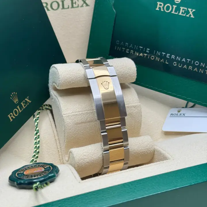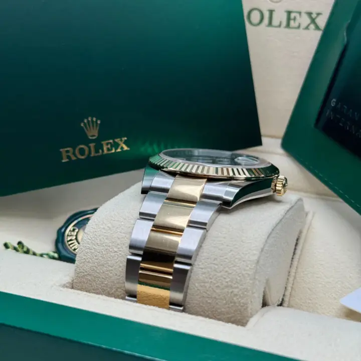 The Rolex fluted bezel is a mark of distinction. Originally, the fluting of the Oyster bezel had a functional purpose: it served to screw the bezel onto the case helping to ensure the waterproofness of the watch. It was therefore identical to the fluting on the case back, which was also screwed onto the case for waterproofness, using specific Rolex tools. Over time, the fluting became an aesthetic element, a genuine Rolex signature feature. Today the fluted bezel is a mark of distinction, in gold on this Datejust 41.