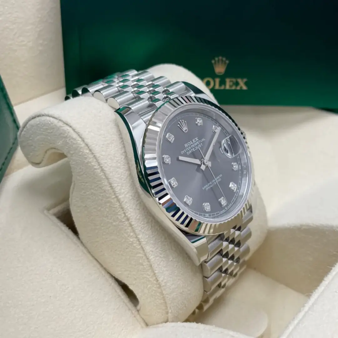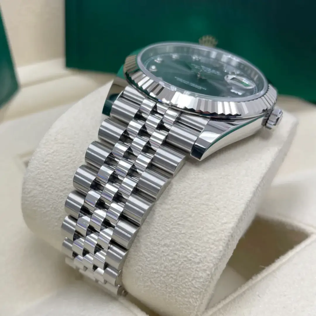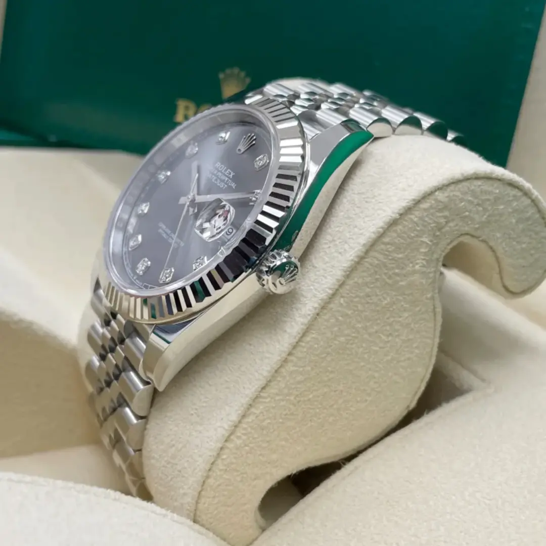 The Rolex fluted bezel is a mark of distinction. Originally, the fluting of the Oyster bezel had a functional purpose: it served to screw the bezel onto the case helping to ensure the waterproofness of the watch. It was therefore identical to the fluting on the case back, which was also screwed onto the case for waterproofness, using specific Rolex tools. Over time, the fluting became an aesthetic element, a genuine Rolex signature feature. Today the fluted bezel is a mark of distinction, in gold on this Datejust 41.