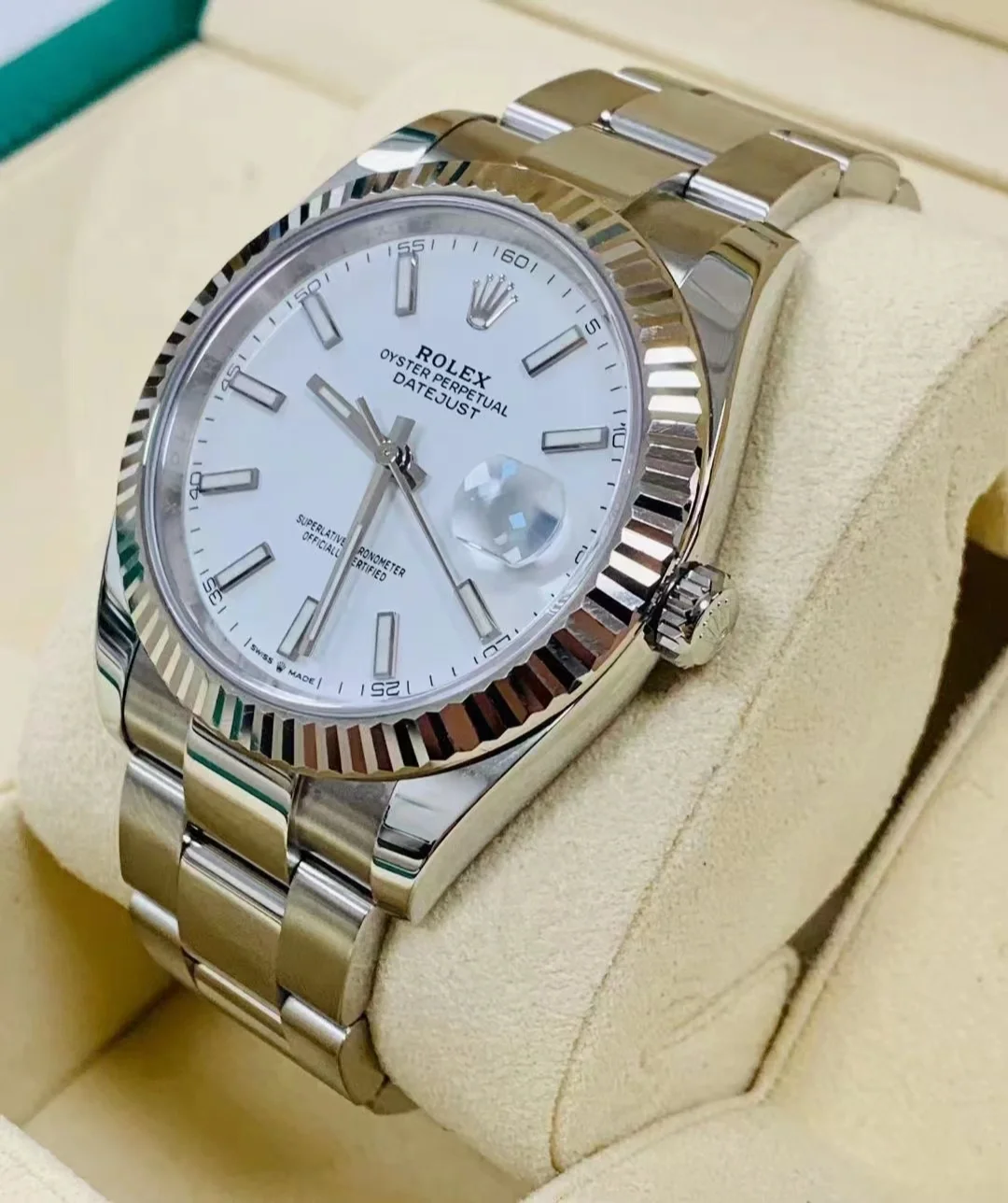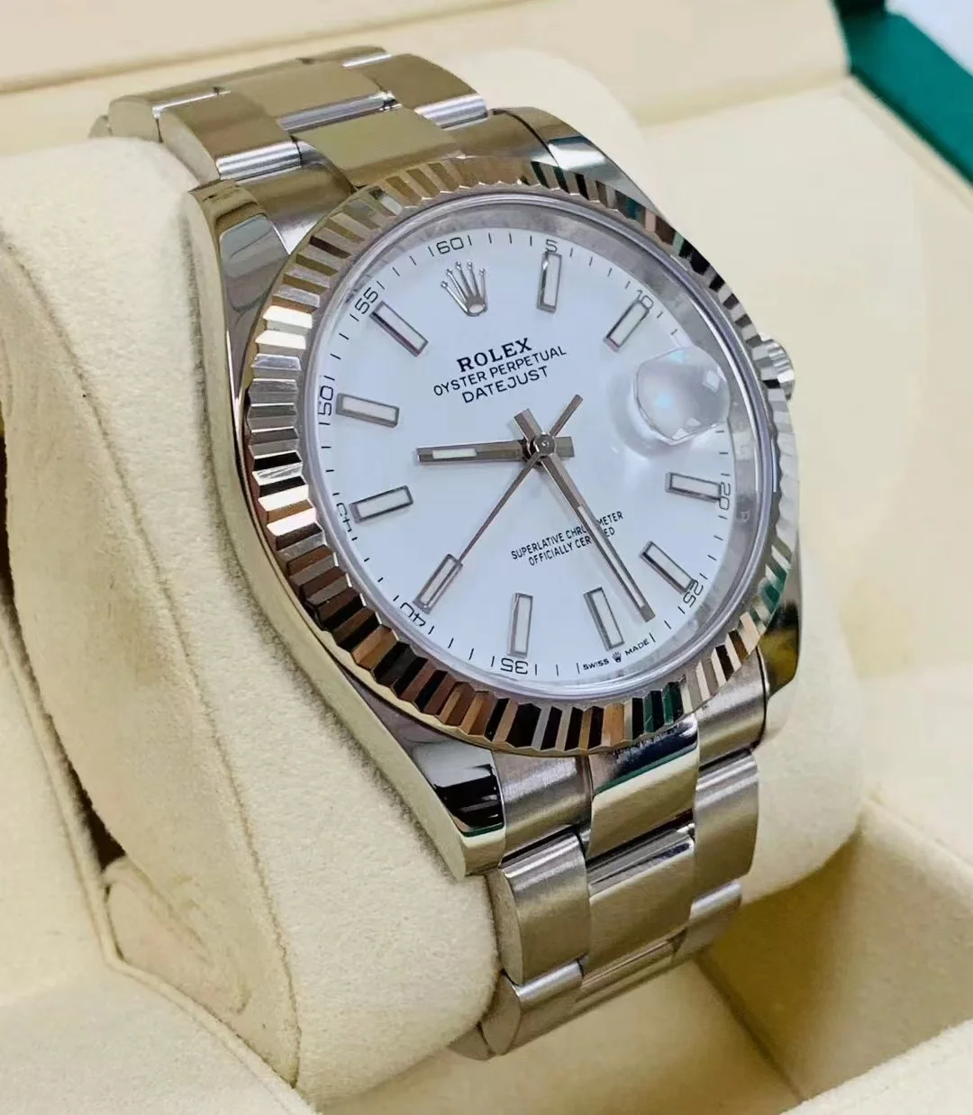 The Rolex fluted bezel is a mark of distinction. Originally, the fluting of the Oyster bezel had a functional purpose: it served to screw the bezel onto the case helping to ensure the waterproofness of the watch. It was therefore identical to the fluting on the case back, which was also screwed onto the case for waterproofness, using specific Rolex tools. Over time, the fluting became an aesthetic element, a genuine Rolex signature feature. Today the fluted bezel is a mark of distinction, in gold on this Datejust 41.