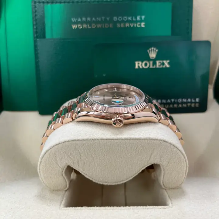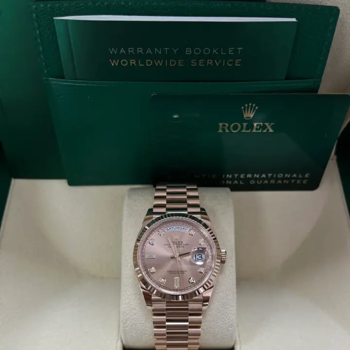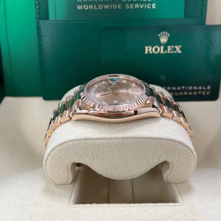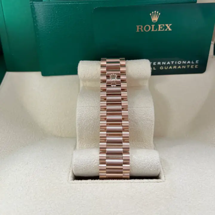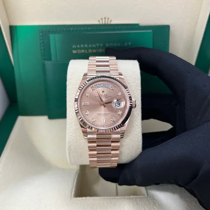 To preserve the beauty of its pink gold watches, Rolex created and patented an exclusive 18 ct pink gold alloy cast in its own foundry: Everose gold. Introduced in 2005, 18 ct Everose is used on all Rolex Oyster models in pink gold.