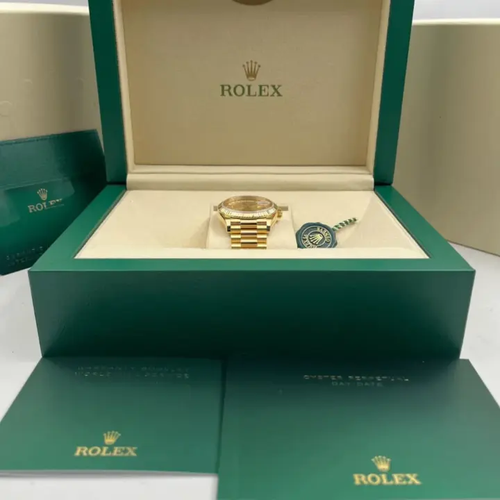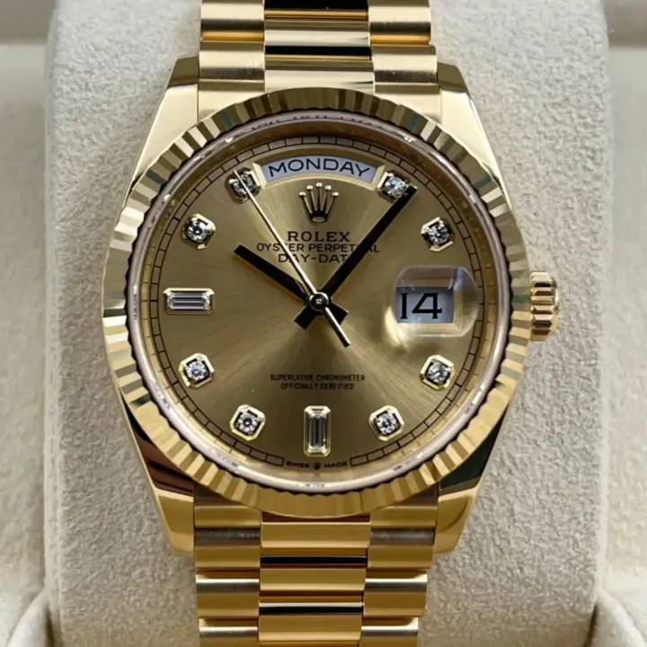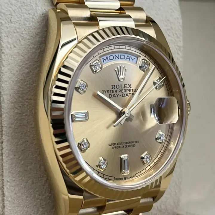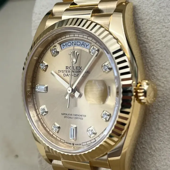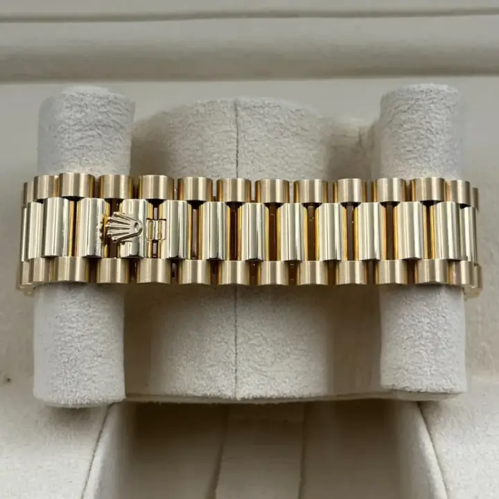 The Rolex fluted bezel is a mark of distinction. Originally, the fluting of the Oyster bezel had a functional purpose: it served to screw the bezel onto the case helping to ensure the waterproofness of the watch. It was therefore identical to the fluting on the case back, which was also screwed onto the case for waterproofness, using specific Rolex tools. Over time, the fluting became an aesthetic element, a genuine Rolex signature feature. Today the fluted bezel is a mark of distinction, in gold on this Day-Date 36.