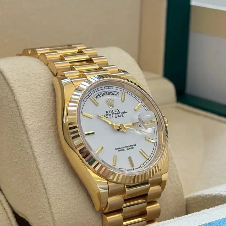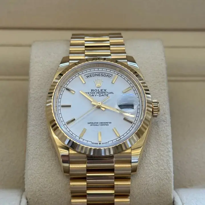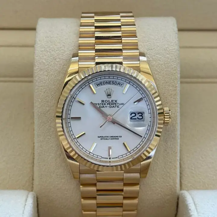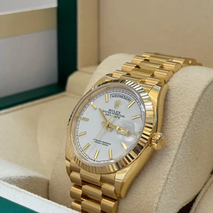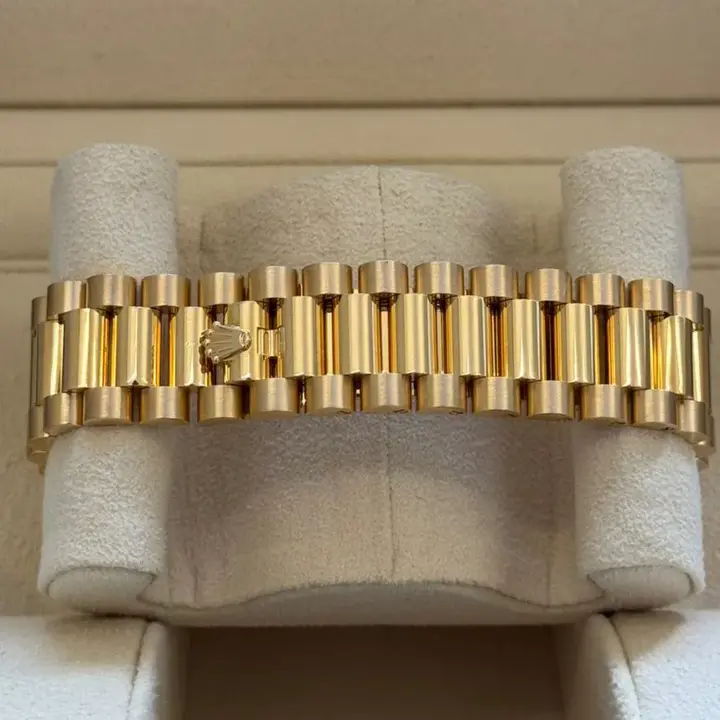 The Rolex fluted bezel is a mark of distinction. Originally, the fluting of the Oyster bezel had a functional purpose: it served to screw the bezel onto the case helping to ensure the waterproofness of the watch. It was therefore identical to the fluting on the case back, which was also screwed onto the case for waterproofness, using specific Rolex tools. Over time, the fluting became an aesthetic element, a genuine Rolex signature feature. Today the fluted bezel is a mark of distinction, in gold on this Day-Date 36.