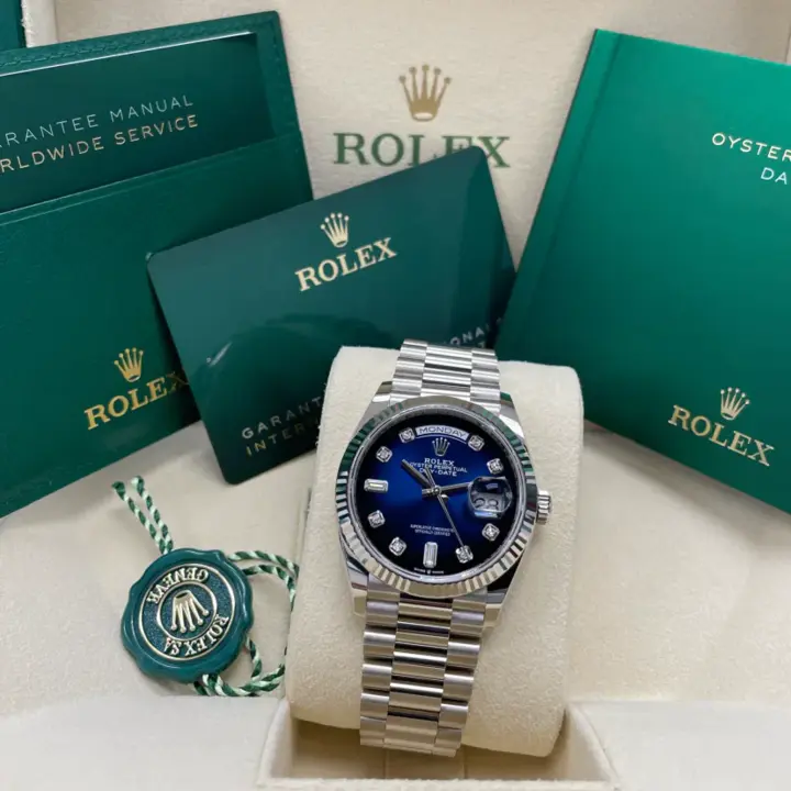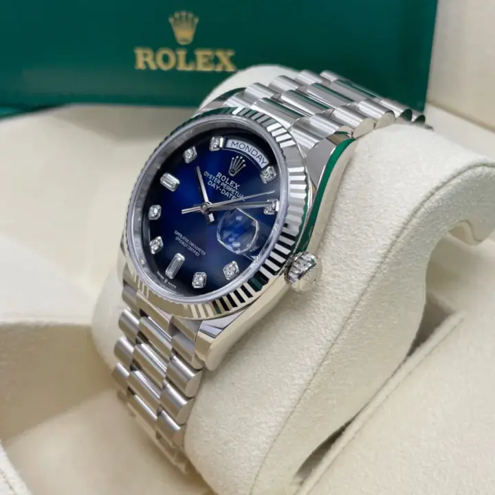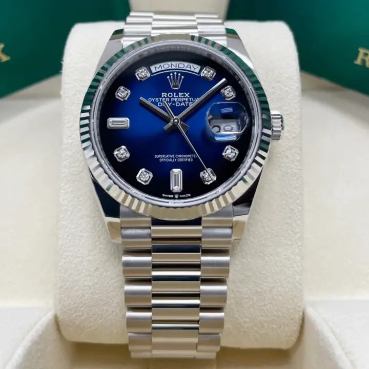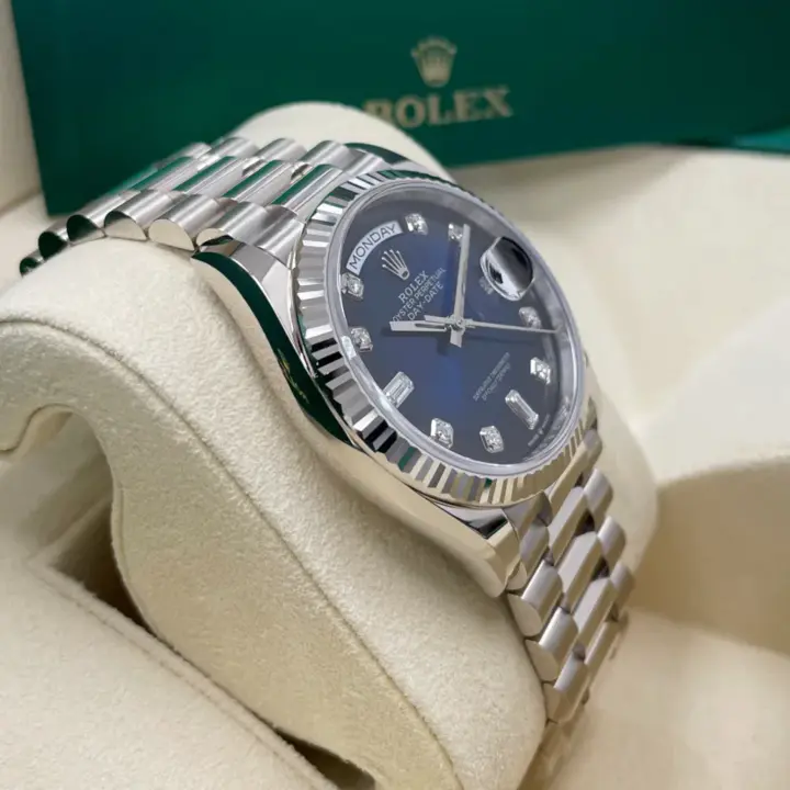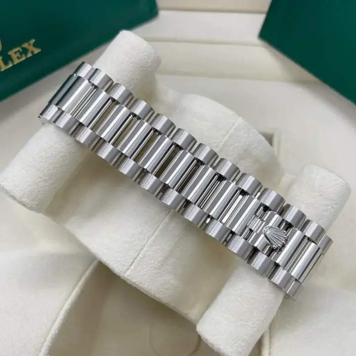 The Rolex fluted bezel is a mark of distinction. Originally, the fluting of the Oyster bezel had a functional purpose: it served to screw the bezel onto the case helping to ensure the waterproofness of the watch. It was therefore identical to the fluting on the case back, which was also screwed onto the case for waterproofness, using specific Rolex tools. Over time, the fluting became an aesthetic element, a genuine Rolex signature feature. Today the fluted bezel is a mark of distinction, in gold on this Day-Date 36.