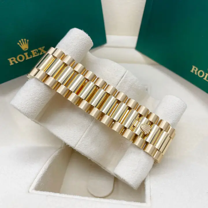 The Rolex fluted bezel is a mark of distinction. Originally, the fluting of the Oyster bezel had a functional purpose: it served to screw the bezel onto the case helping to ensure the waterproofness of the watch. It was therefore identical to the fluting on the case back, which was also screwed onto the case for waterproofness, using specific Rolex tools. Over time, the fluting became an aesthetic element, a genuine Rolex signature feature. Today the fluted bezel is a mark of distinction, in gold on this Day-Date 40.
