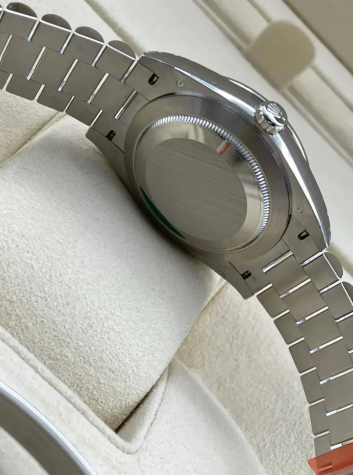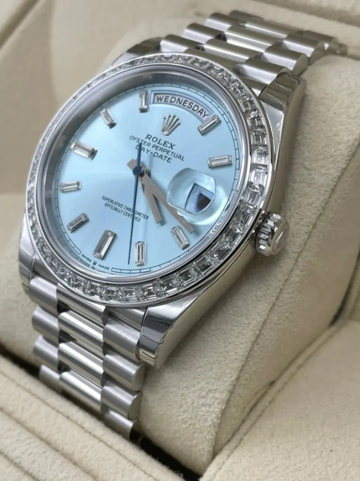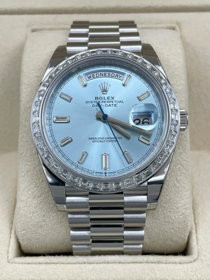 The ice-blue dial is the discreet and exclusive signature of a Rolex platinum watch. Rolex uses platinum, the noblest of metals, for the finest of watches. These exclusive dials can be found only on the Day-Date and the Cosmograph Daytona.