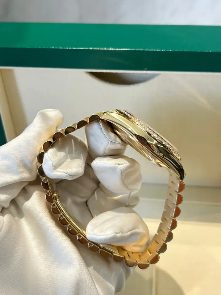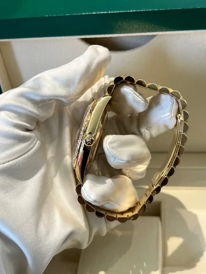 Gem-setters, like sculptors, finely carve the precious metal to hand-shape the seat in which each gemstone will be perfectly lodged. With the art and craft of a jeweller, the stone is placed and meticulously aligned with the others, then firmly secured in its gold or platinum setting. Besides the intrinsic quality of the stones, several other criteria contribute to the beauty of Rolex gem-setting: the precise alignment of the height of the gems, their orientation and position, the regularity, strength and proportions of the setting as well as the intricate finishing of the metalwork. A sparkling symphony to enhance the watch and enchant the wearer.
