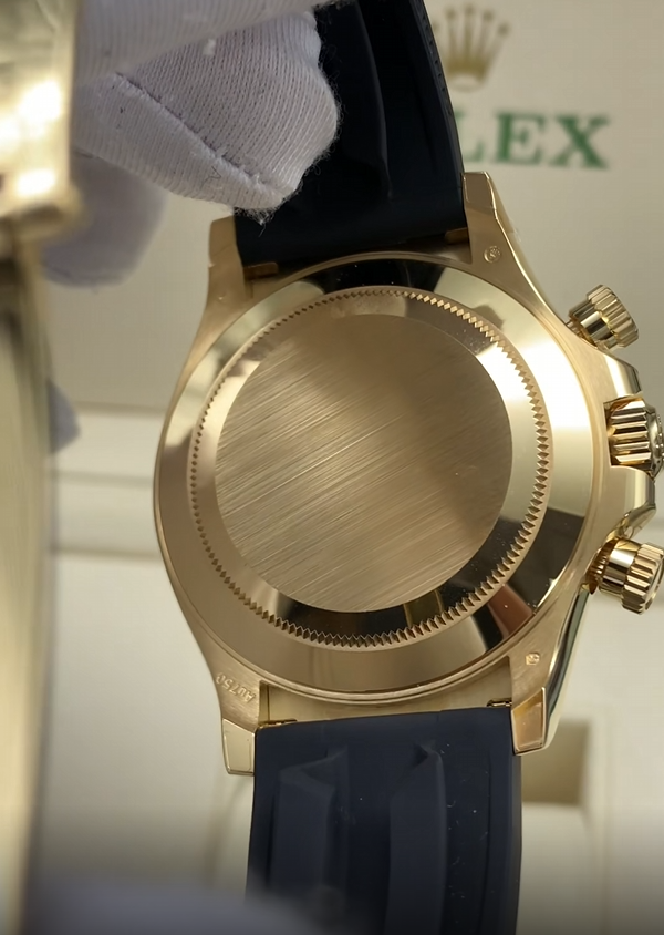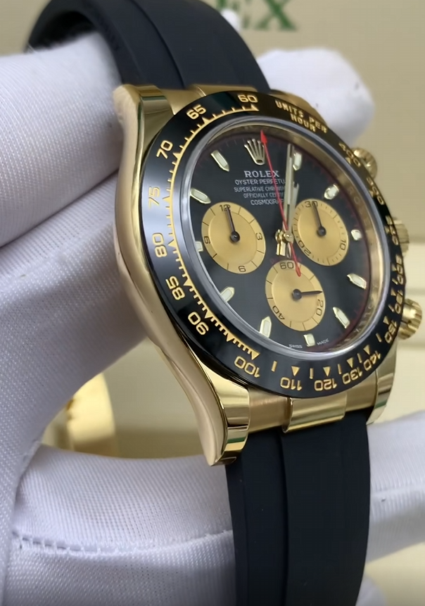 The 18 kt gold versions of the Cosmograph Daytona with a Cerachrom bezel are available with an Oysterflex bracelet. Developed by Rolex and patented, it singularly combines the robustness of a metal bracelet with the comfort of an elastomer bracelet.