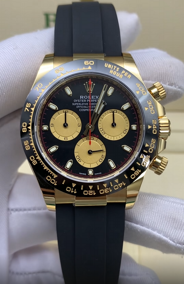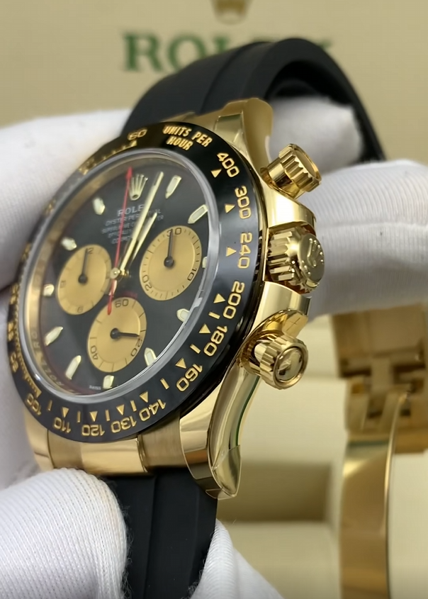 This Oyster Perpetual Cosmograph Daytona in 18 kt yellow gold, with an intense black and champagne-colour dial and an Oysterflex bracelet, features a black Cerachrom bezel with tachymetric scale.