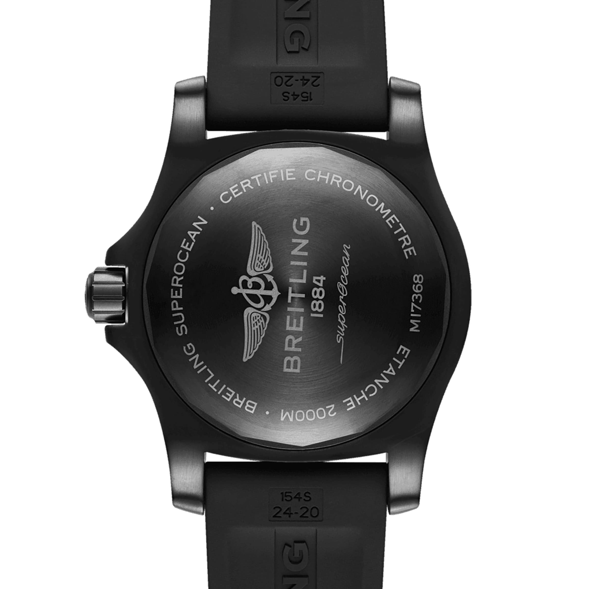 Power, functionality and cool, contemporary style define Breitling’s Superocean Automatic collection: tool watches for the active, modern diver. Built to last, the Superocean Automatic 46 features a sturdy 46-mm black steel (DLC-coated stainless steel) case, black dial and a matching Diver Pro III rubber strap with pin buckle or folding clasp. Complete with ratcheted unidirectional bezel, and water-resistant up to an impressive 200 bar (2000 meters), it is the ultimate in robustness and reliability for deep-sea adventurers.