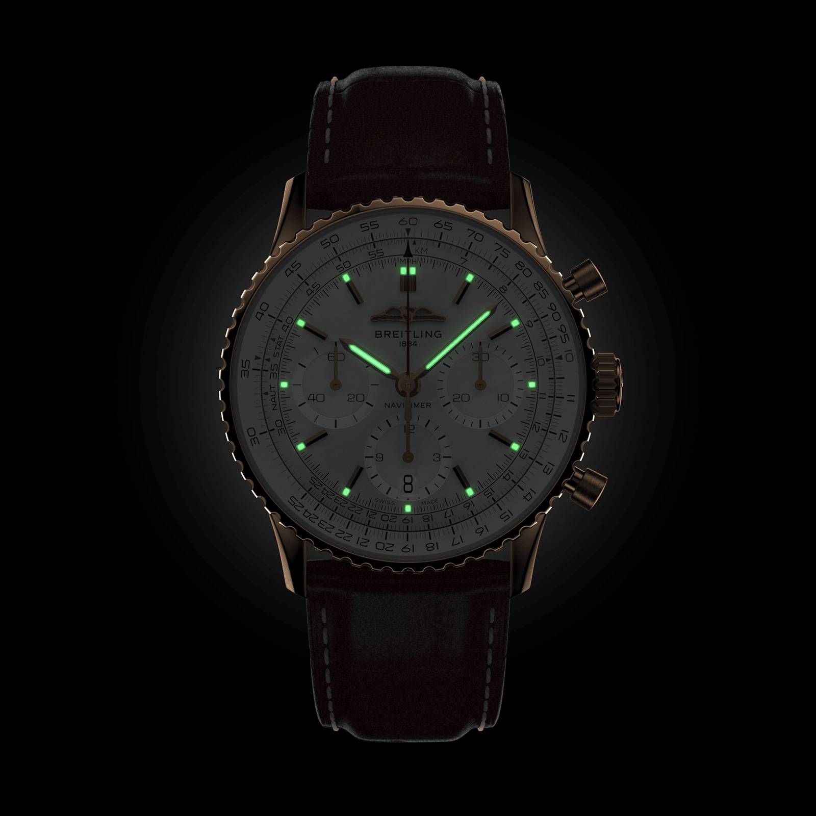 The understated dial presents iconic Navitimer details such as red gold baton indexes and chronograph counters alongside red gold hands.