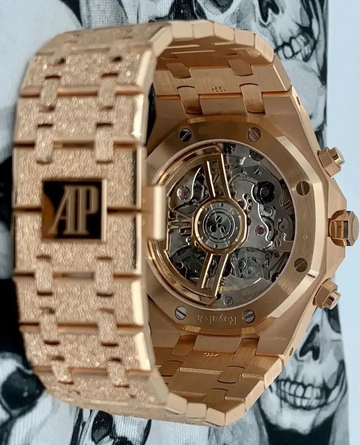 Blue dial with “Grande Tapisserie” pattern, pink gold-toned counters, pink gold applied hour-markers and Royal Oak hands with luminescent coating.