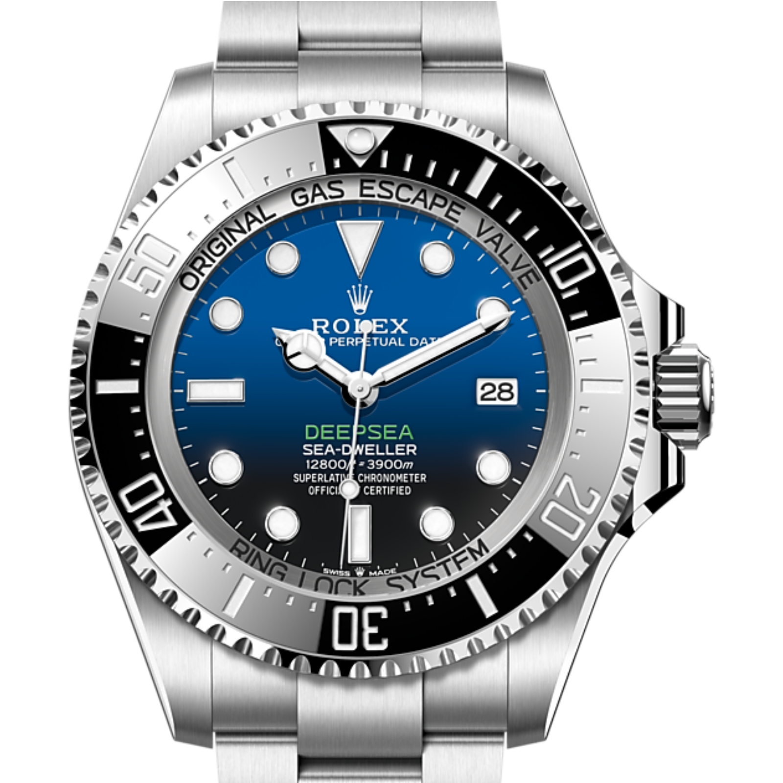 Commemorating James Cameron's historic solo dive. From brilliant blue to bottomless black, its two-colour gradient dial celebrates one man's journey to the deepest place on earth: the bottom of the Mariana Trench.