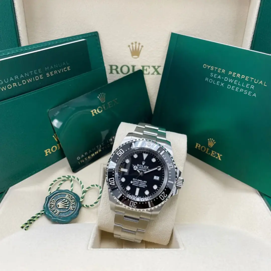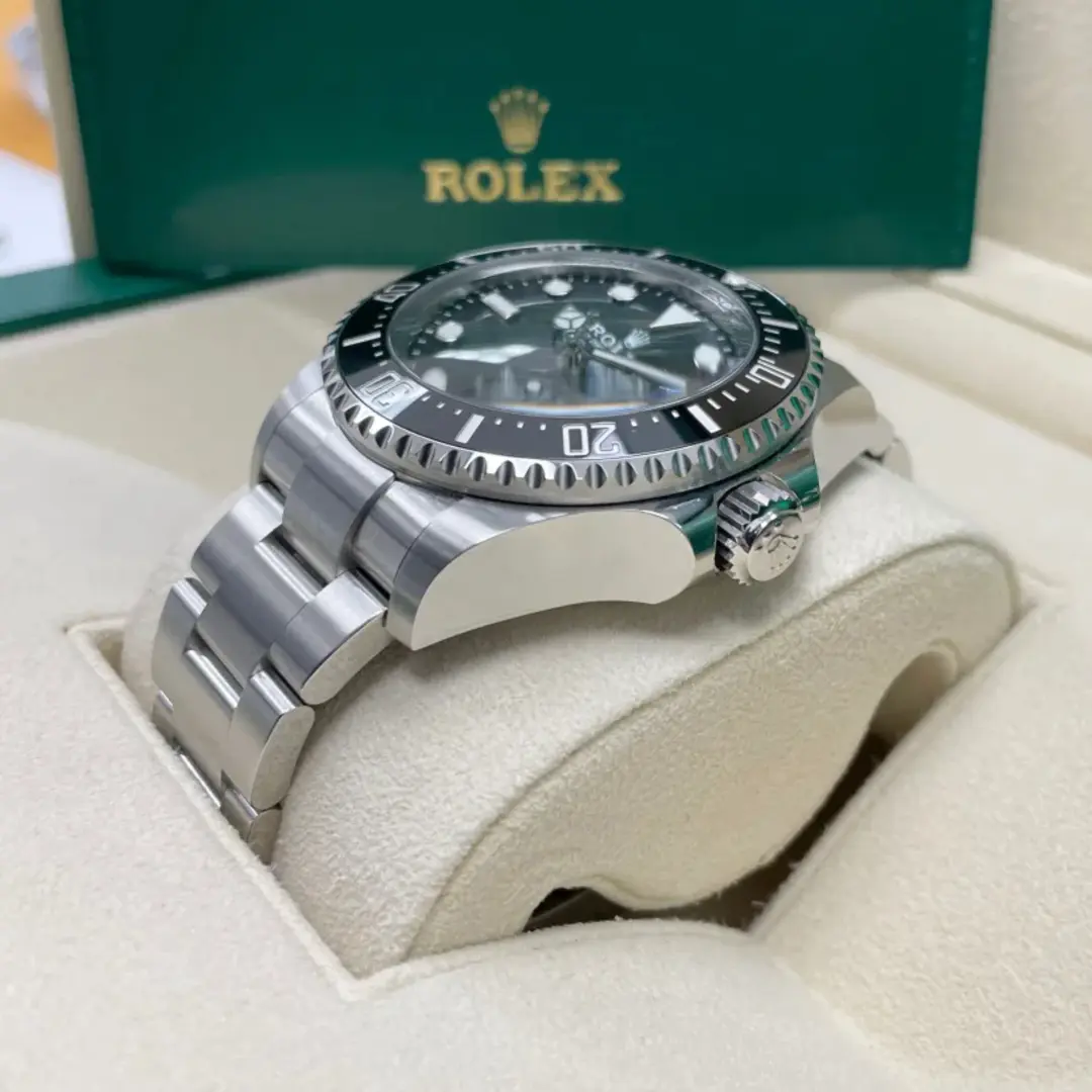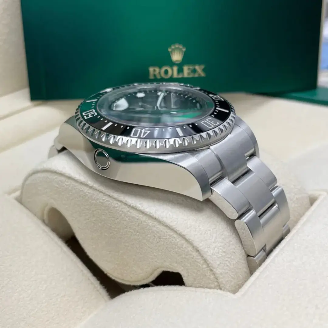 The 60-minute graduated, unidirectional rotatable bezel of the Rolex Deepsea enables divers to precisely and safely monitor their dive and decompression times. It is equipped with a patented black Cerachrom bezel insert manufactured by Rolex in a virtually scratchproof ceramic whose colour is unaffected by ultraviolet rays. The graduation is coated via PVD (Physical Vapour Deposition) with a thin layer of platinum. The sleek black dial features large Chromalight hour markers and hands, filled with luminescent material that emits a long-lasting blue glow for excellent legibility in dark conditions.