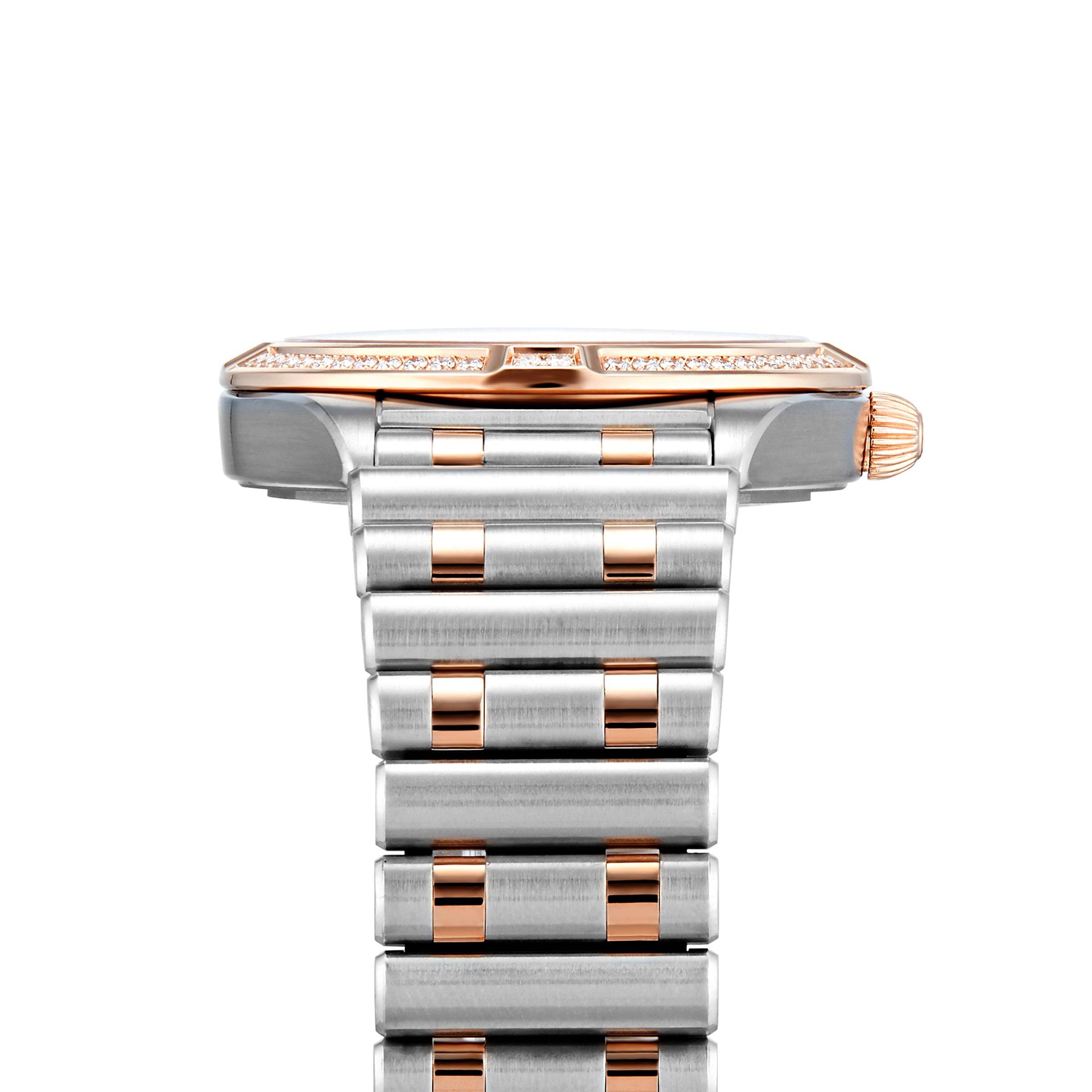 A diamond set bezel is mounted to a 32mm 18k red gold and stainless steel case presented on a two-tone bracelet.