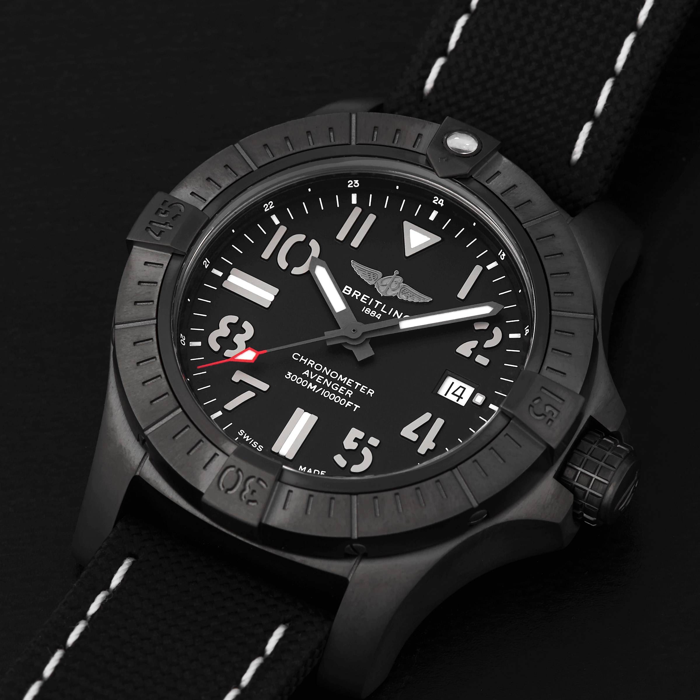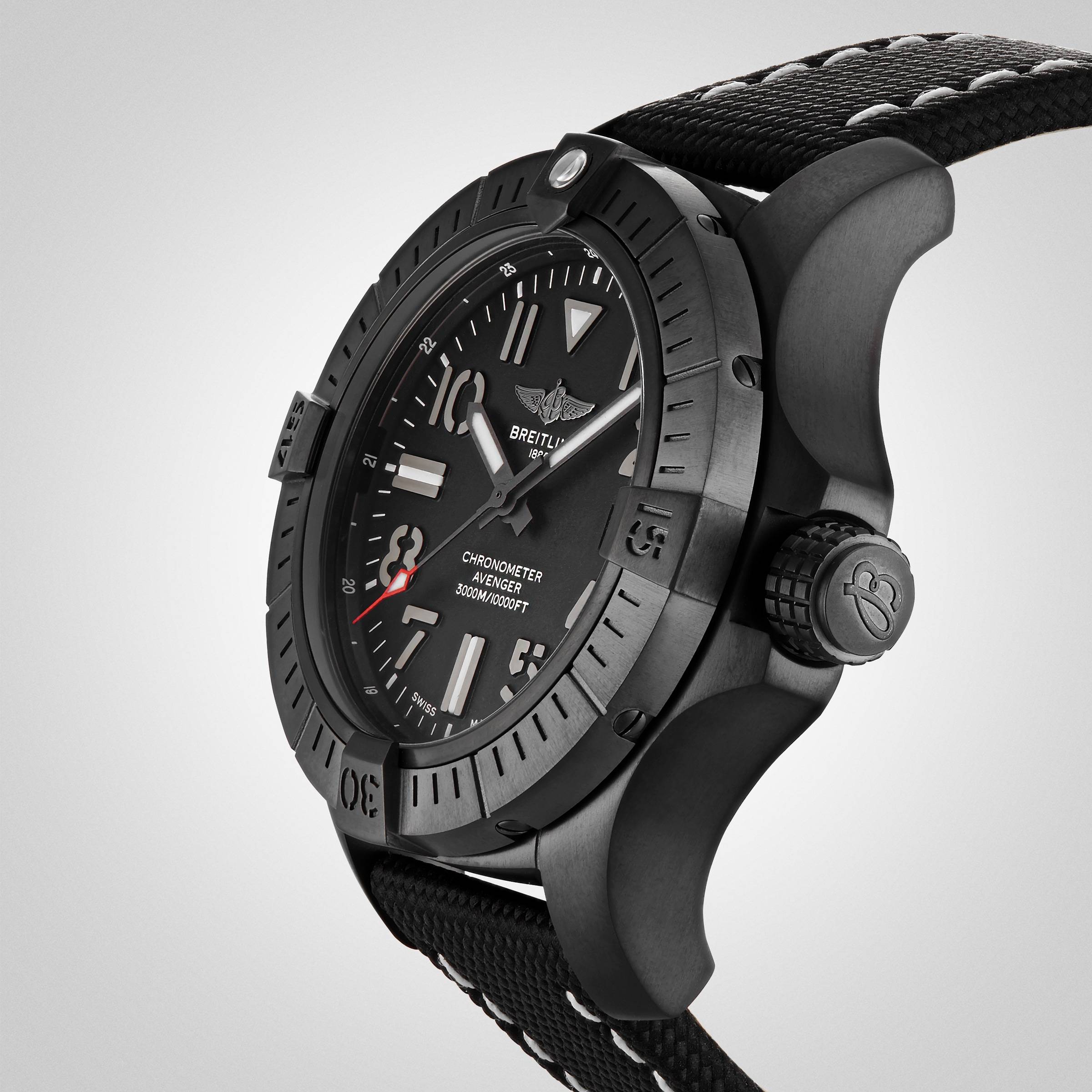 This 45mm Avenger Automatic Seawolf Night Mission model boasts a DLC-coated titanium case with a rugged bezel and grip pattern on the crown for easy use while wearing gloves.
