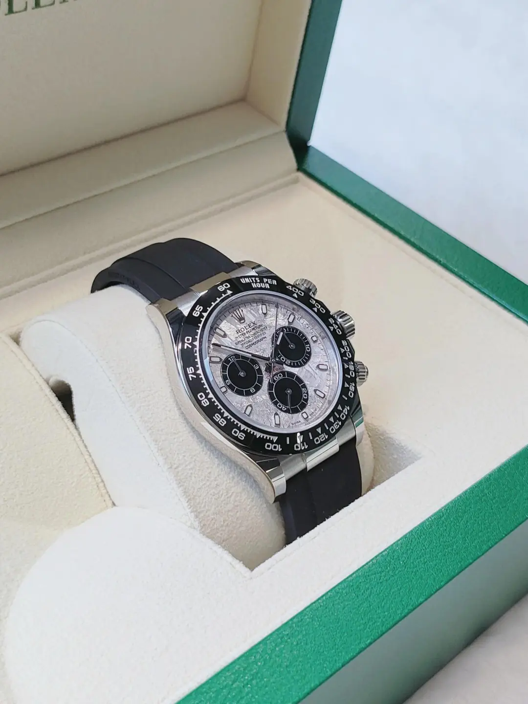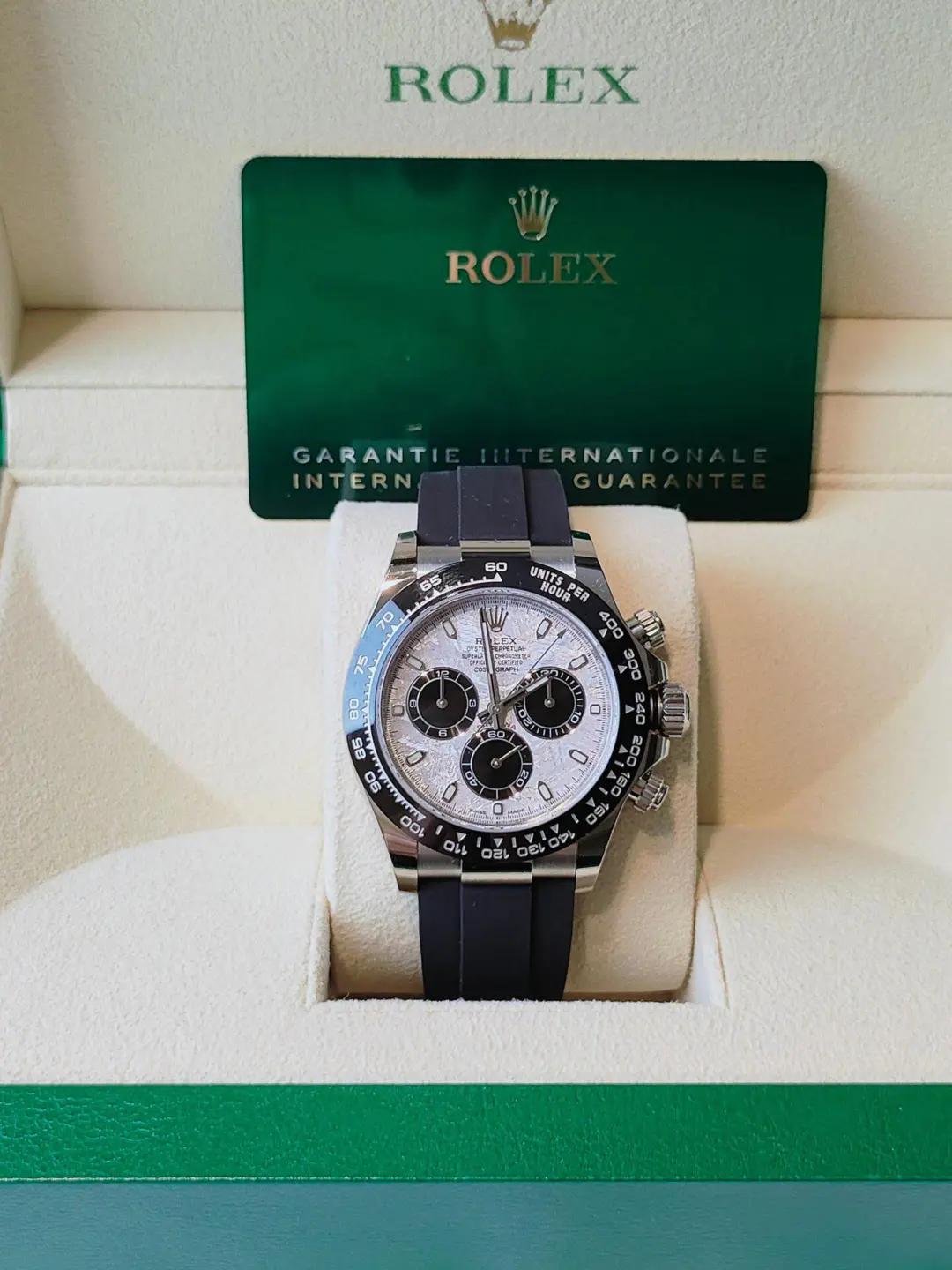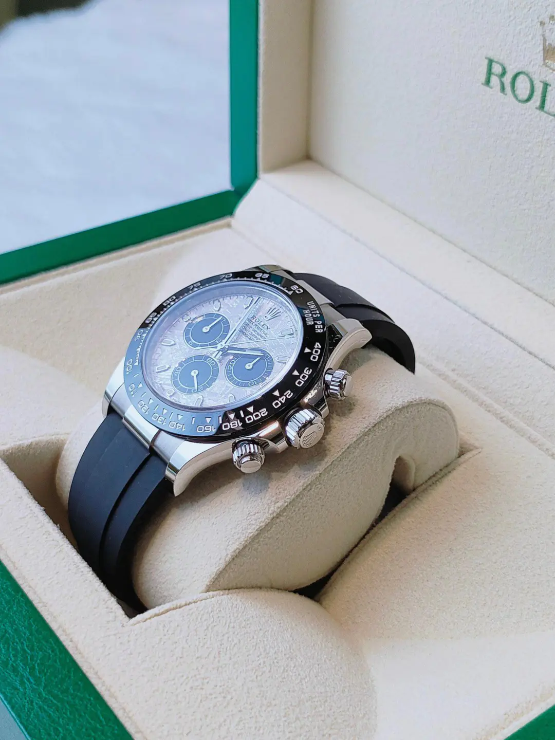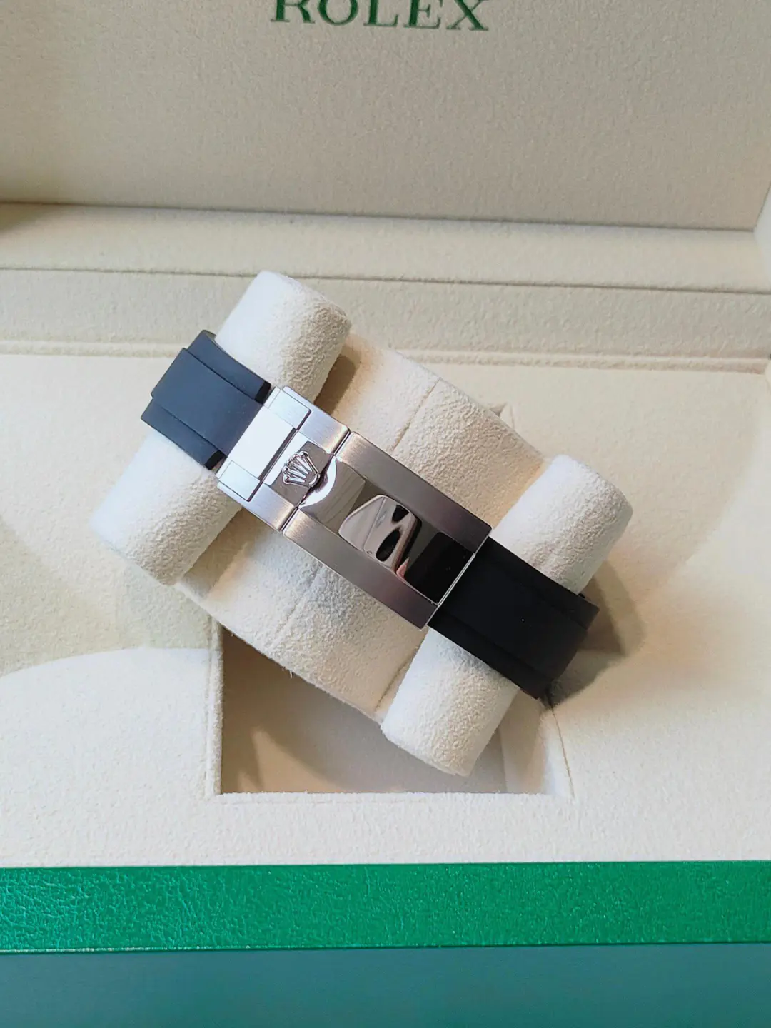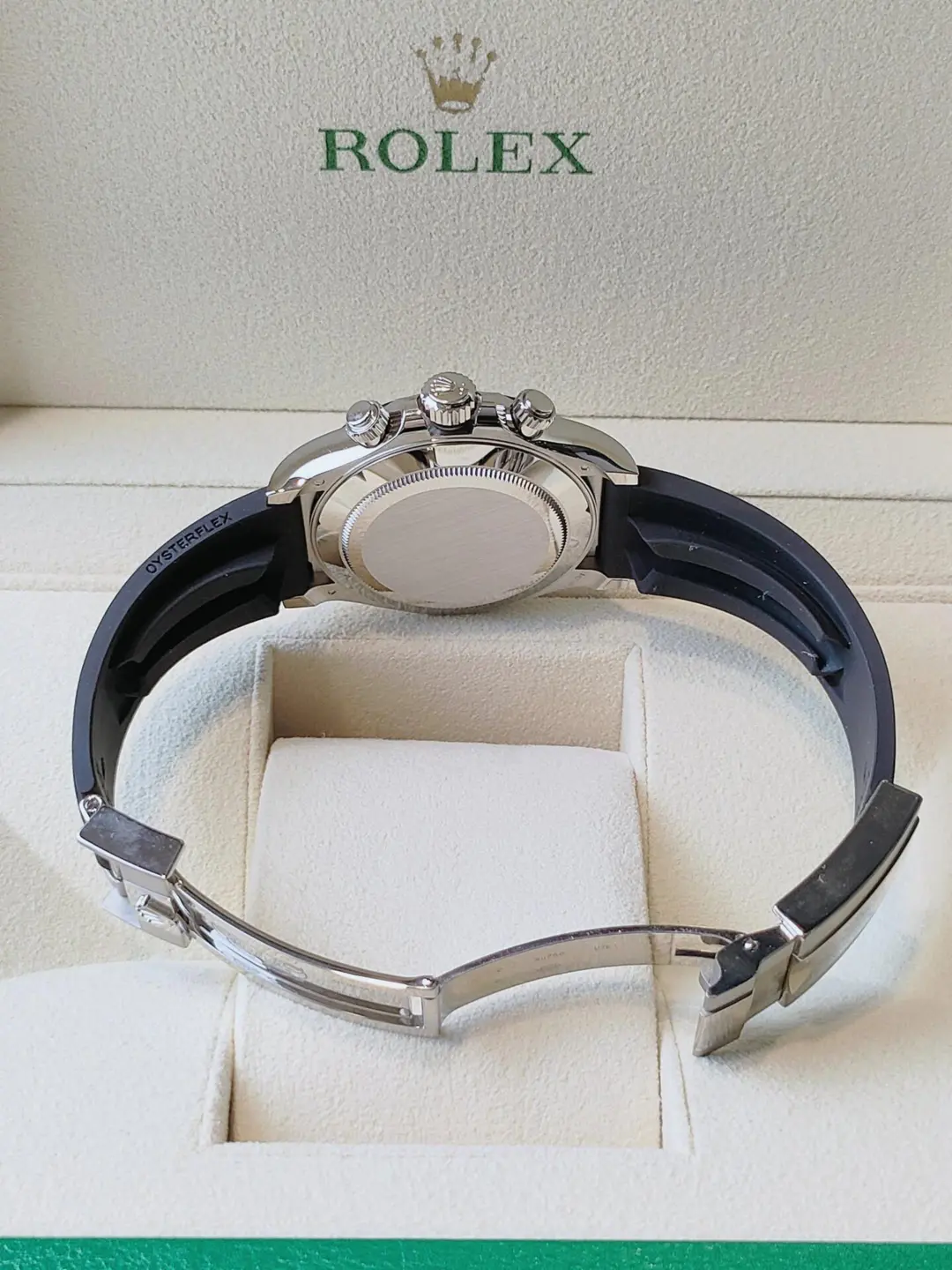 The 18 ct gold versions of the Cosmograph Daytona with a Cerachrom bezel are available with an Oysterflex bracelet. Developed by Rolex and patented, it singularly combines the robustness of a metal bracelet with the comfort of an elastomer bracelet. It is made up of two flexible curved metal blades – one in each bracelet section – overmoulded with high-performance black elastomer. For optimum comfort, the Oysterflex bracelet is equipped with cushions on its inner sides and an Oysterlock safety clasp to prevent accidental opening. Its length may be adjusted via the ingenious Rolex Glidelock extension system.