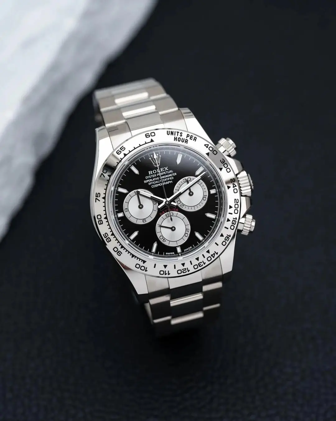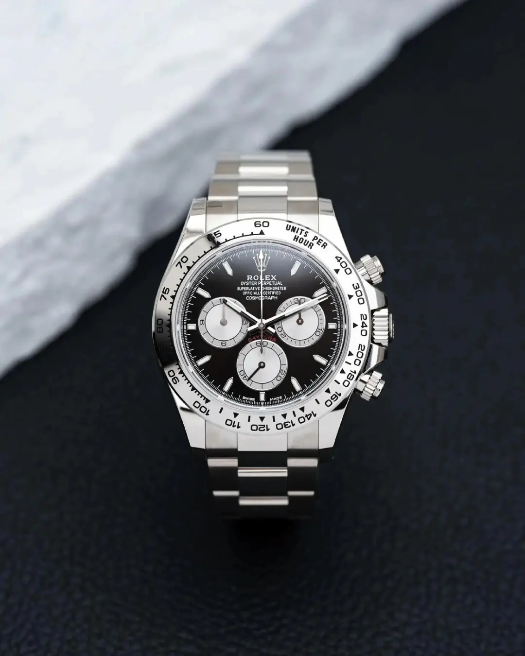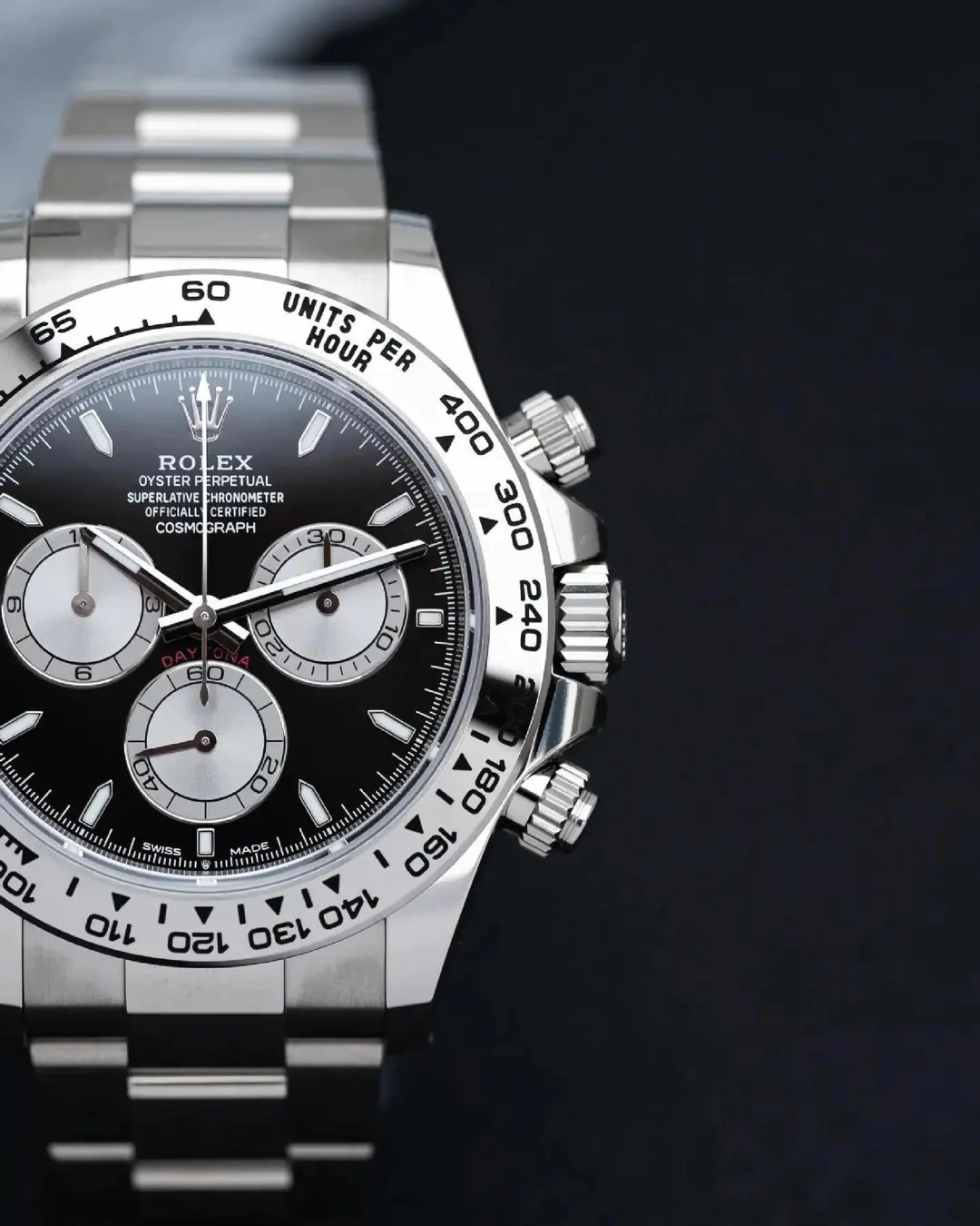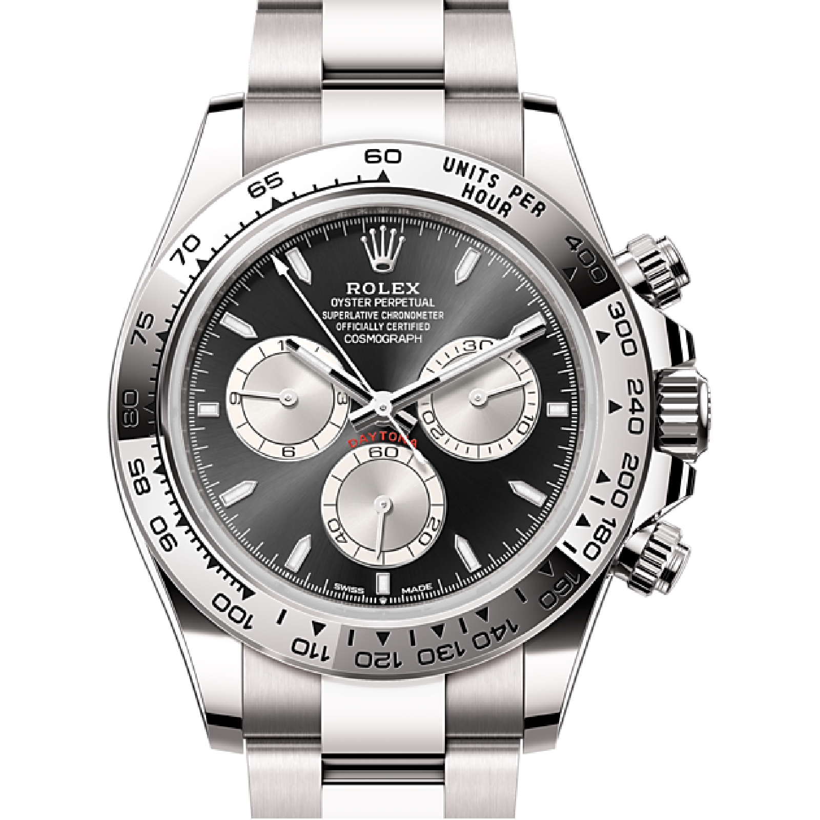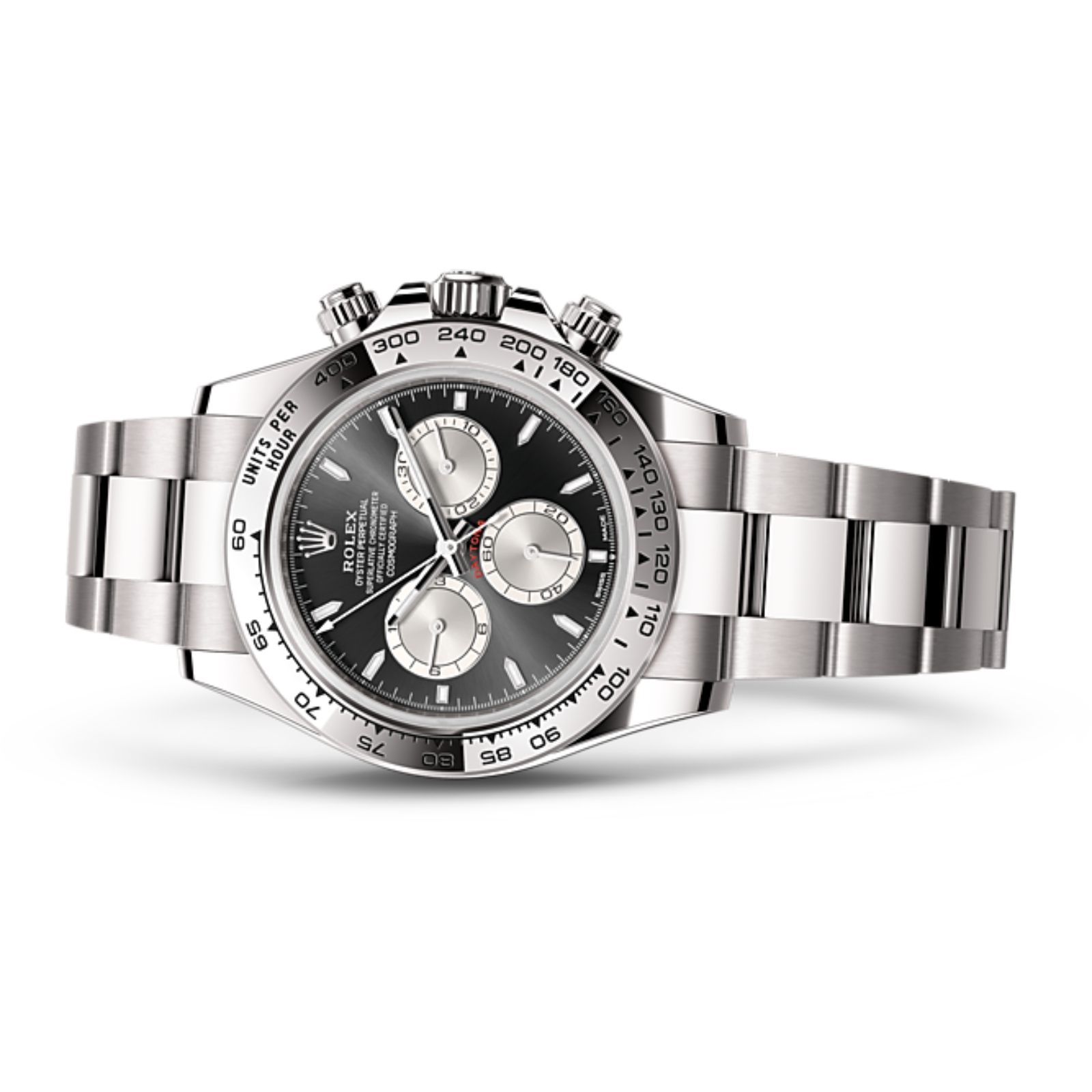 With its tachymetric scale, its three counters and its pushers, the Cosmograph Daytona was designed to be the ultimate timing tool for endurance racing drivers. The bezel features a tachymetric scale to read average speed over a given distance based on elapsed time. This scale offers optimal legibility, making the Cosmograph Daytona the ideal instrument for measuring speeds up to 400 units per hour, expressed in kilometres or miles.