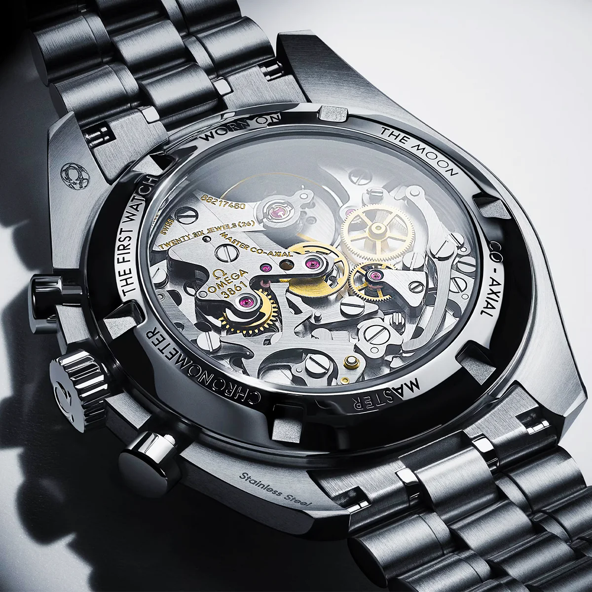 This OMEGA Moonwatch has a white lacquered step dial with blackened hands and hour indexes. Sapphire crystal glass and water resistant up to 50m. Power reserve up to 50 hours. Manual-wind OMEGA 3861 movement. Stainless steel 42mm case and black bezel all on a matching stainless steel bracelet.