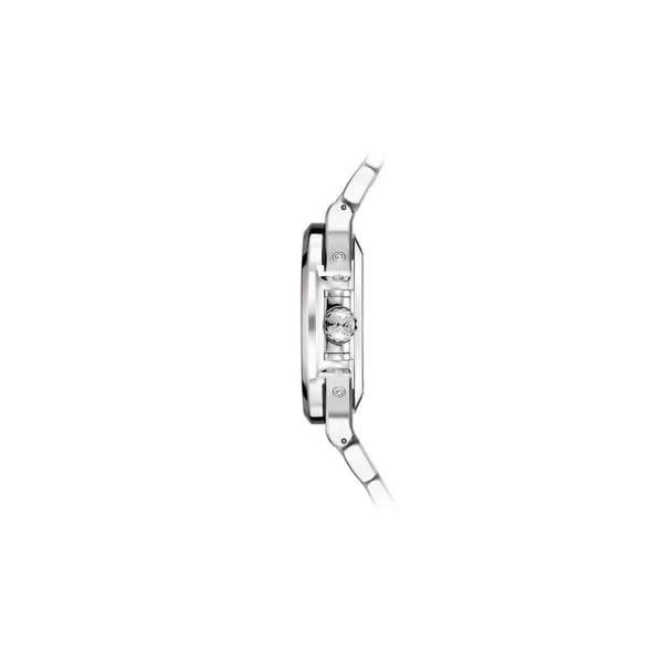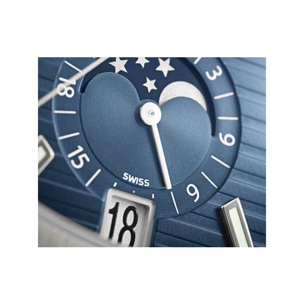 Hours, minutes, day, date, month in apertures, moon phases, 24-hour indication, sweep seconds hand.