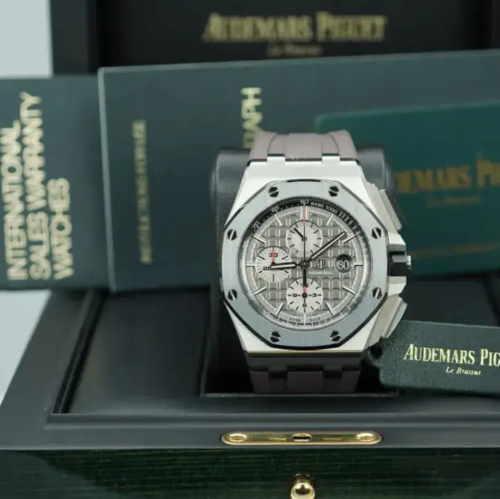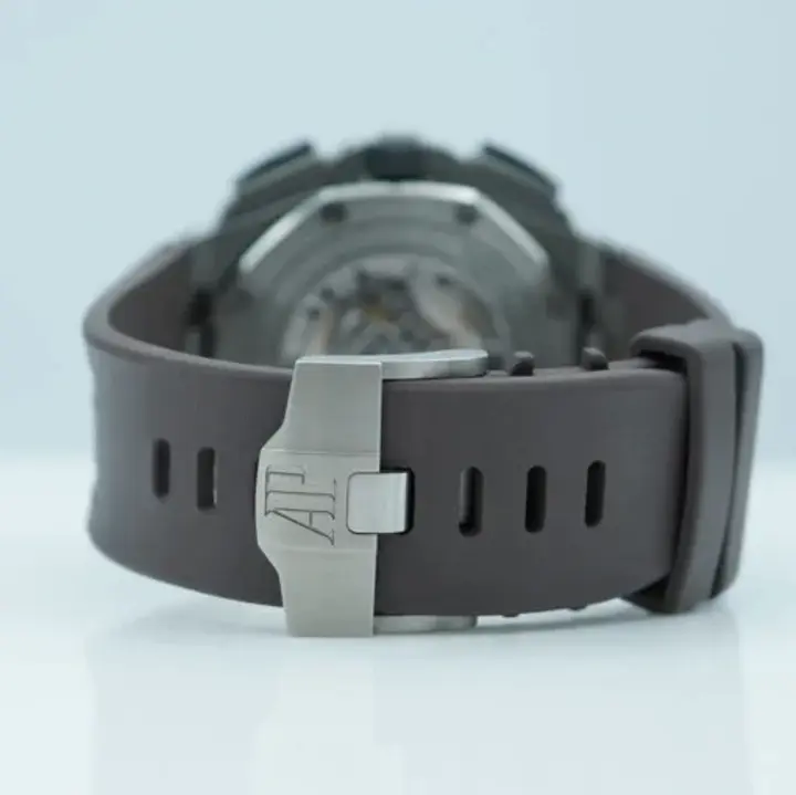 Black dial with “Méga Tapisserie” pattern, rhodium-toned counters, white gold applied hour-markers and Royal Oak hands with luminescent coating, slate grey inner bezel.
