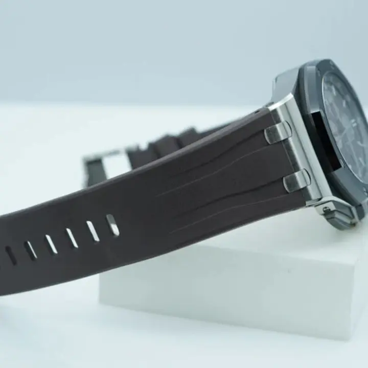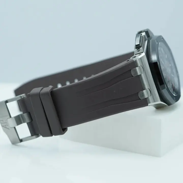 Black rubber strap with titanium pin buckle.