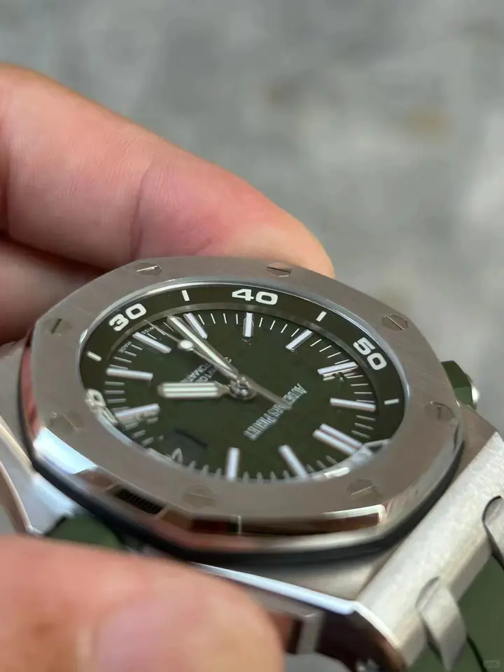 Khaki dial with “Méga Tapisserie” pattern, white gold applied hour-markers and Royal Oak hands with luminescent coating, khaki rotating inner bezel with zone from 60 to 15 minutes in white.