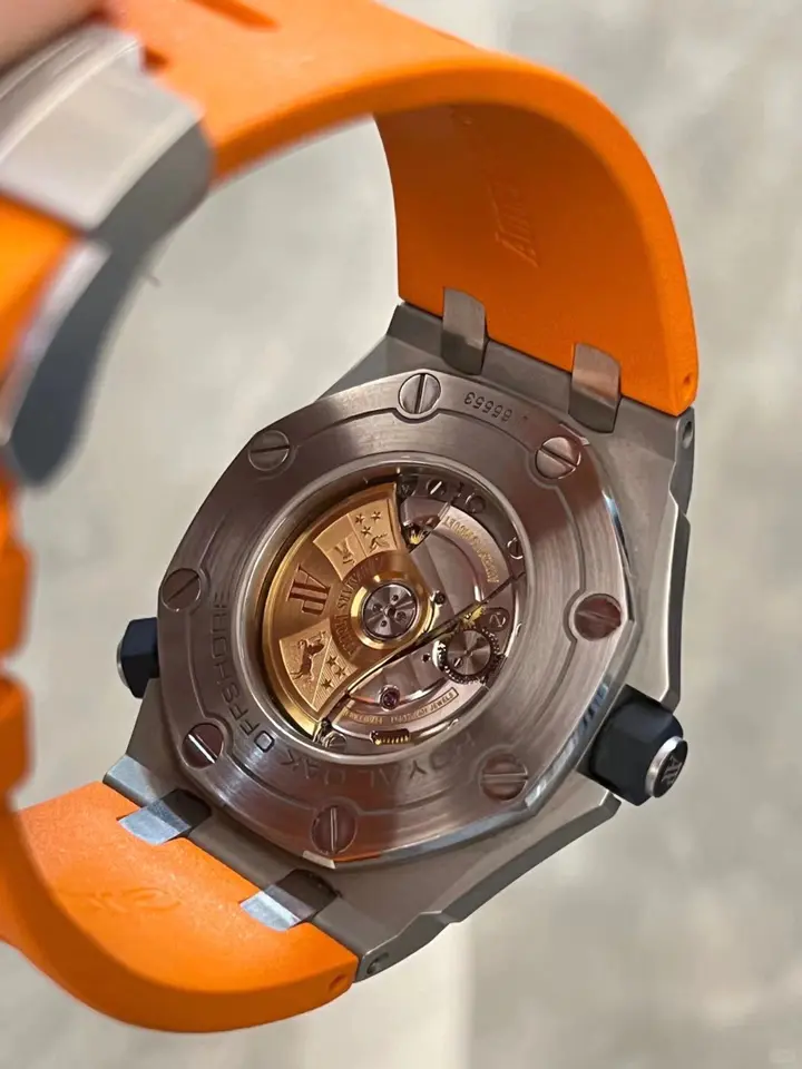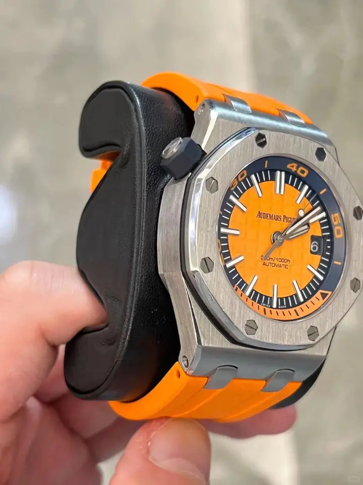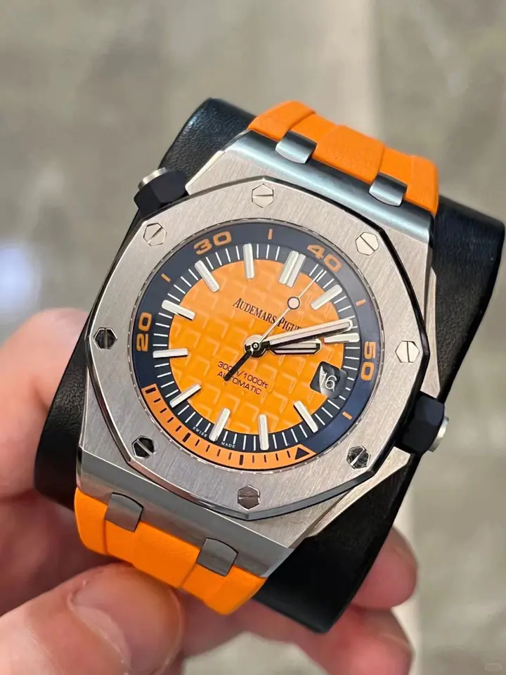 Orange dial with “Méga Tapisserie” pattern, white gold applied hour-markers and Royal Oak hands with luminescent coating, blue rotating inner bezel with diving scale and zone from 60 to 15 minutes in orange