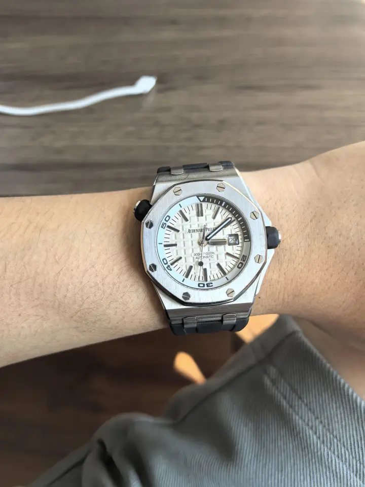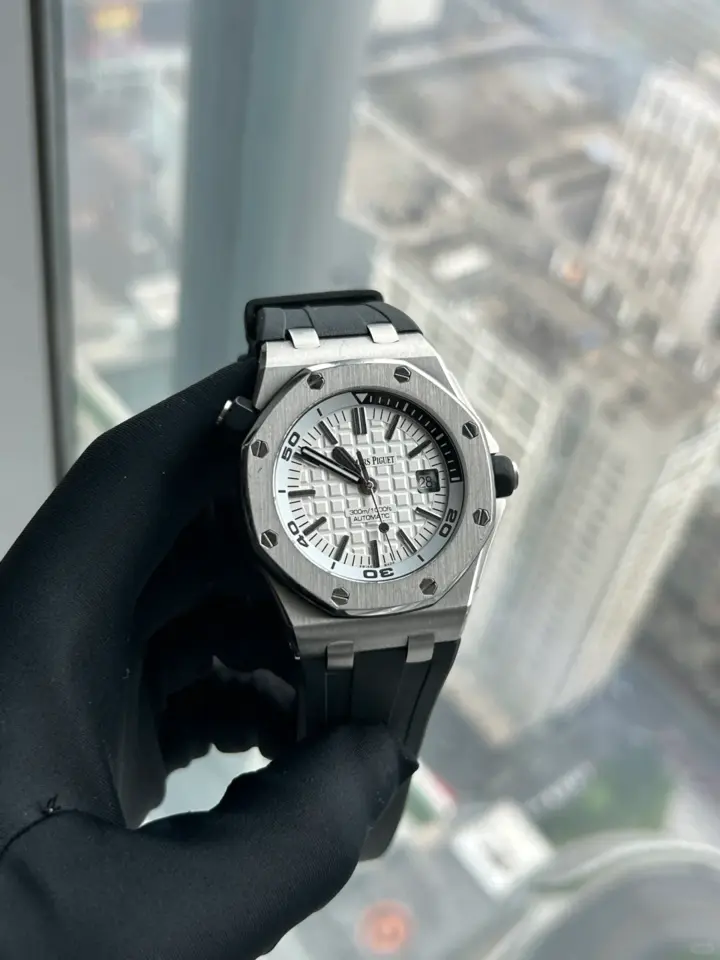 Siver-toned dial with “Méga Tapisserie” pattern, white gold applied hour-markers and Royal Oak hands with luminescent coating (black minutes hand), black or silver-toned rotating inner bezel with diving scale and zone from 60 to 15 minutes in black.