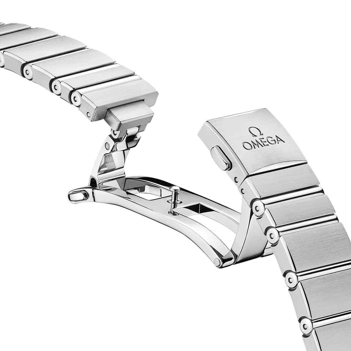 OMEGA Constellation Manhattan 28mm Grey Diamond Dial and Bezel Watch 13115286056001. Stainless steel 28mm case and diamond set bezel all on a matching stainless steel bracelet. This ladies watch has a sunray grey dial with 12 diamond set hour markers. Sapphire crystal glass and water resistant up to 30m. Quartz movement.