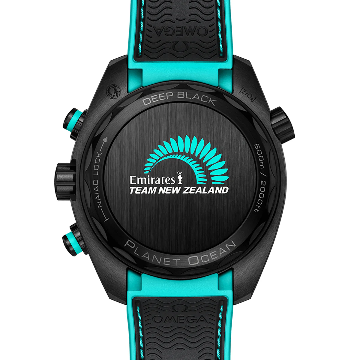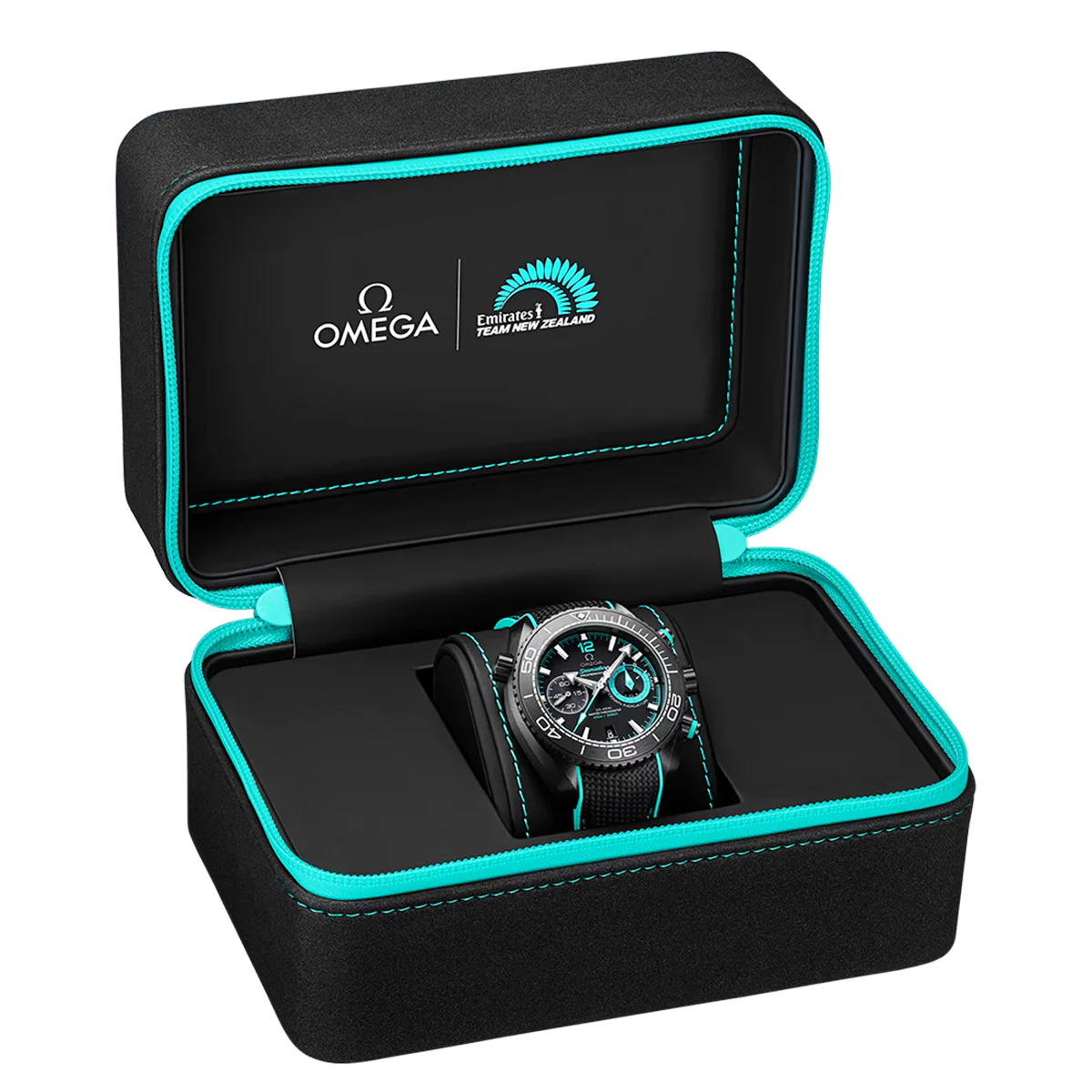 OMEGA Seamaster Planet Ocean 600m 45.5mm ETNZ Edition Deep Black Watch 21592465101003.Black ceramic 45.5mm case and bezel all on a black rubber strap. This men's watch has a black dial with turquoise detail, date display at the 6 o'clock position. Special edition caseback with ETNZ team logo. Sapphire crystal glass and water resistant up to 600m. 60 hours power reserve. Automatic chronograph movement.