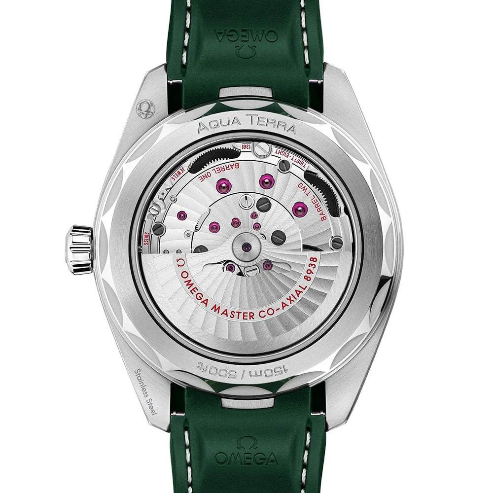 OMEGA Seamaster Aqua Terra GMT Worldtimer 43mm Green Dial Strap Watch 220.32.43.22.10.001. Stainless steel 43mm case and green ceramic bezel all on a green structured rubber strap. This men's watch has a sun-brushed green dial with golden & luminous applied hands and hour markers as well as a date display at the 6 o'clock position & GMT function set around the dial. Water resistant up to 150m and sapphire crystal glass. 60 hour power reserve. OMEGA Calibre 8938 METAS approved automatic movement.