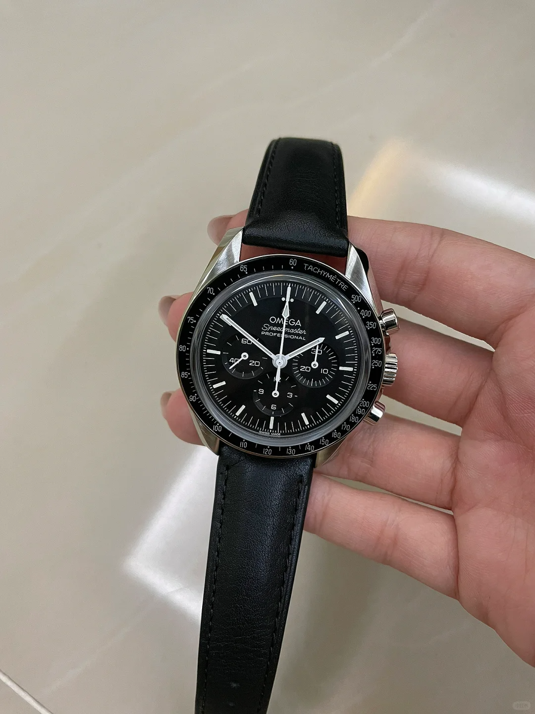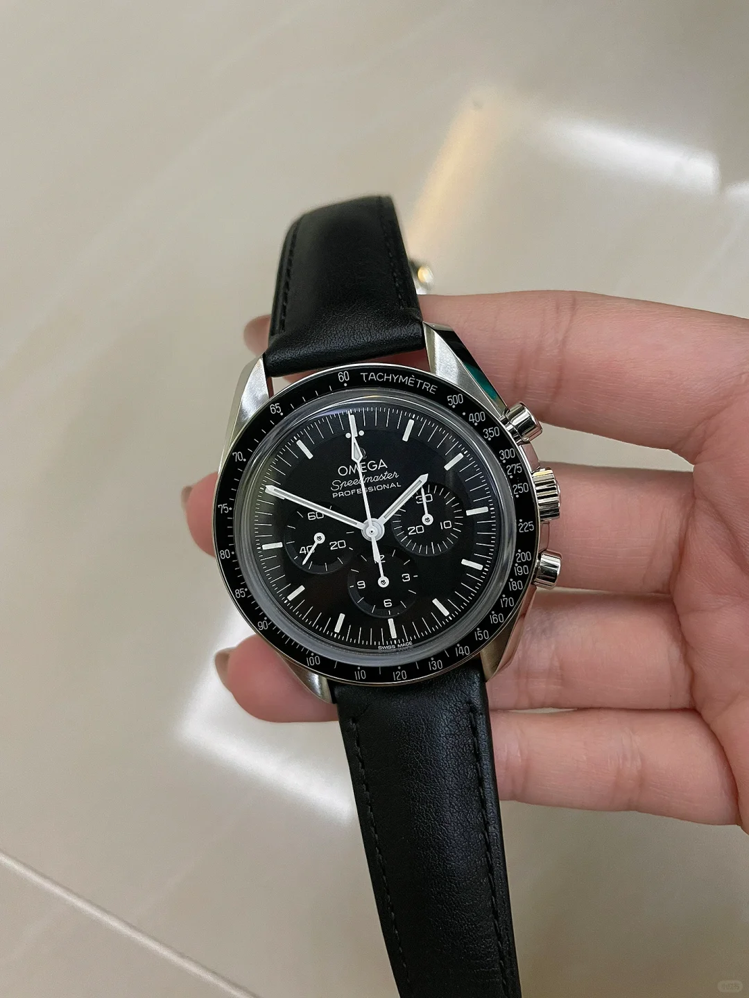 Completing its iconic look on a stylish black leather strap with a steel fastening, this OMEGA Speedmaster Moonwatch Professional Co-Axial Master Chronometer watch is inspired by the fourth generation of the famous Moonwatch. It features the instantly recognisable black chronograph dial surrounded by a matching black tachymeter bezel crafted from anodised aluminium. In true Moonwatch style, the OMEGA Speedmaster watch Features the dot above the 90 marker on the bezel and measures a comfortable 42mm diameter.