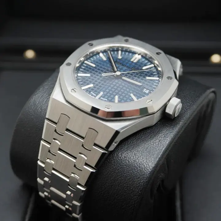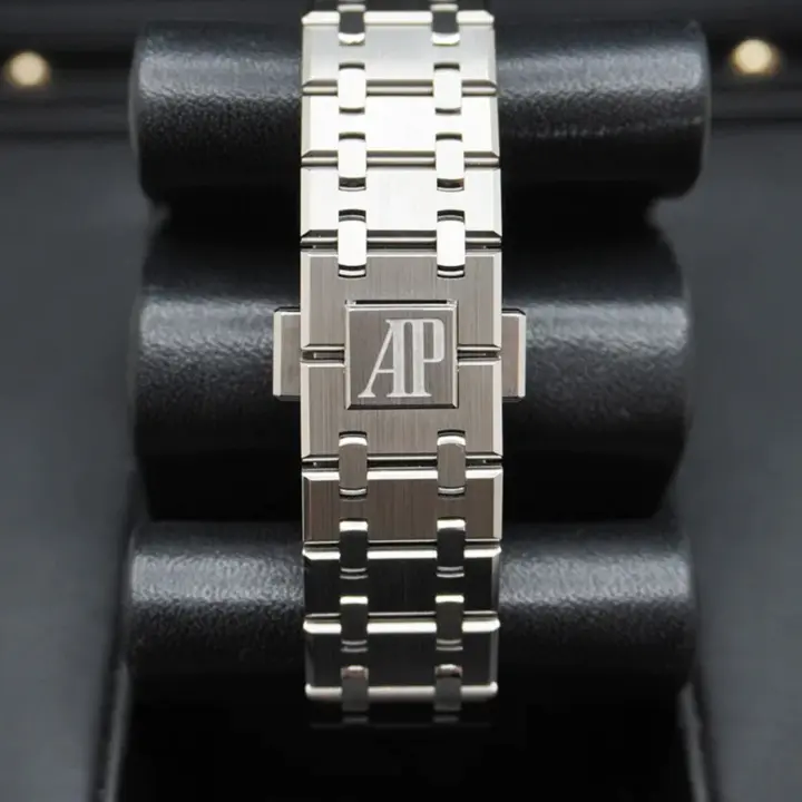 “Bleu nuit nuage 50” dial with “Grande Tapisserie” pattern, white gold applied hour-markers and Royal Oak hands with luminescent coating.
